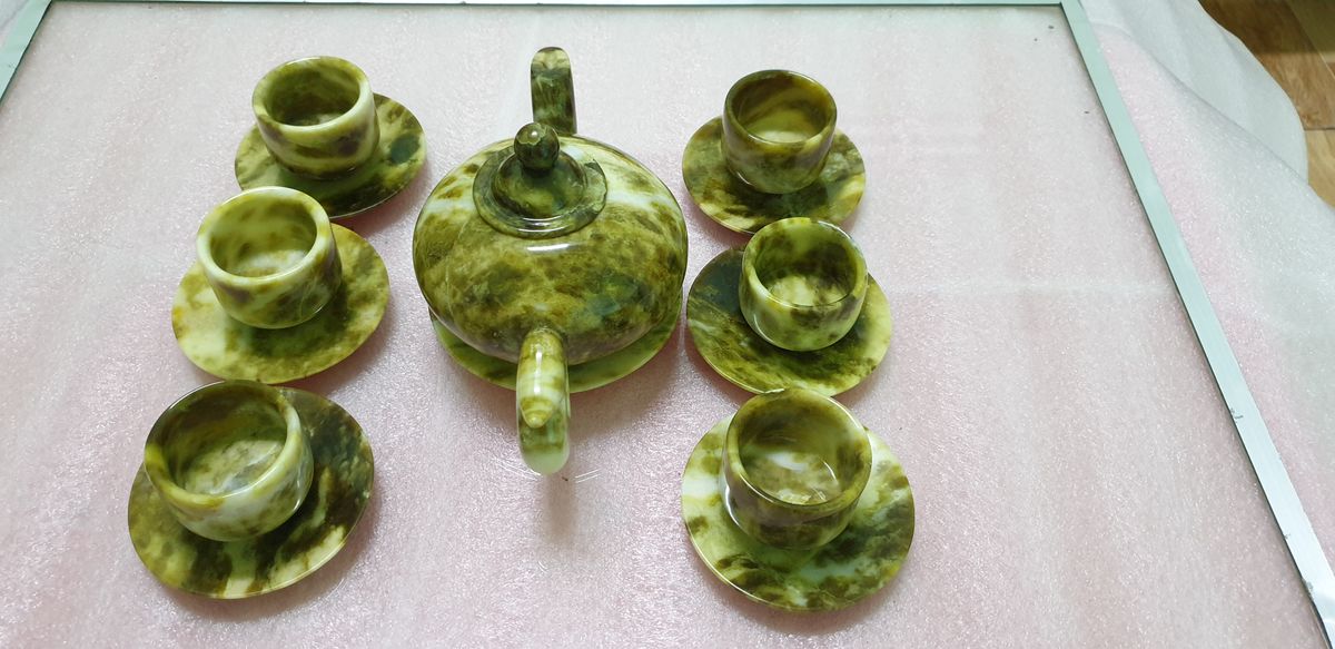 Bộ ấm trà làm từ đá serpentin nguyên khối thiên nhiên .