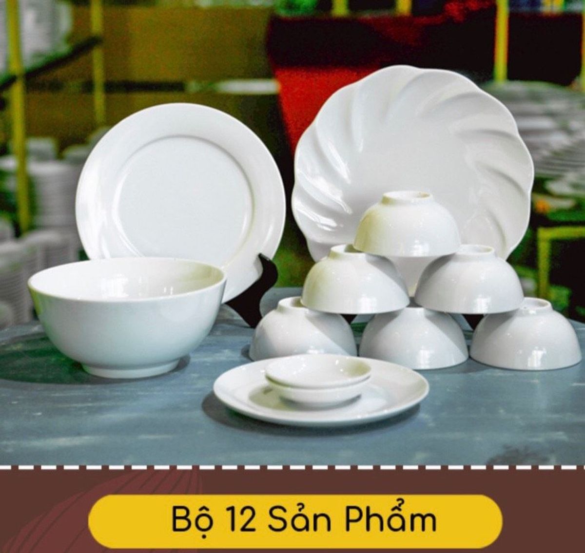Bao gồm 12 món: 6 chén cơm phi 11cm, 1 tô phi 18cm, 2 dĩa bằng phi 20cm, 2 chén chấm phi 8cm, 1 đĩa xoắn phi 23cm.