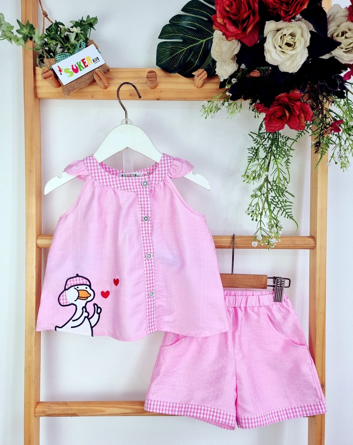 áo may cổ yếm phối vải karo cài nút thêu đắp vịt dễ thương cho bé với quần short mổ túi phối live karo.