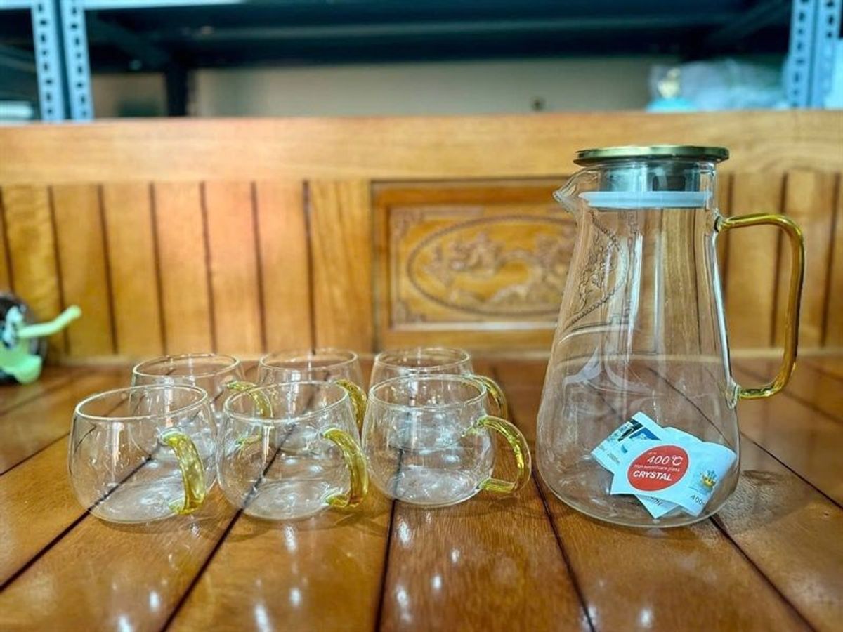 Bộ Bình 6 Cốc Thủy Tinh Trắng Quai Vàng ( THÙNG 8B )