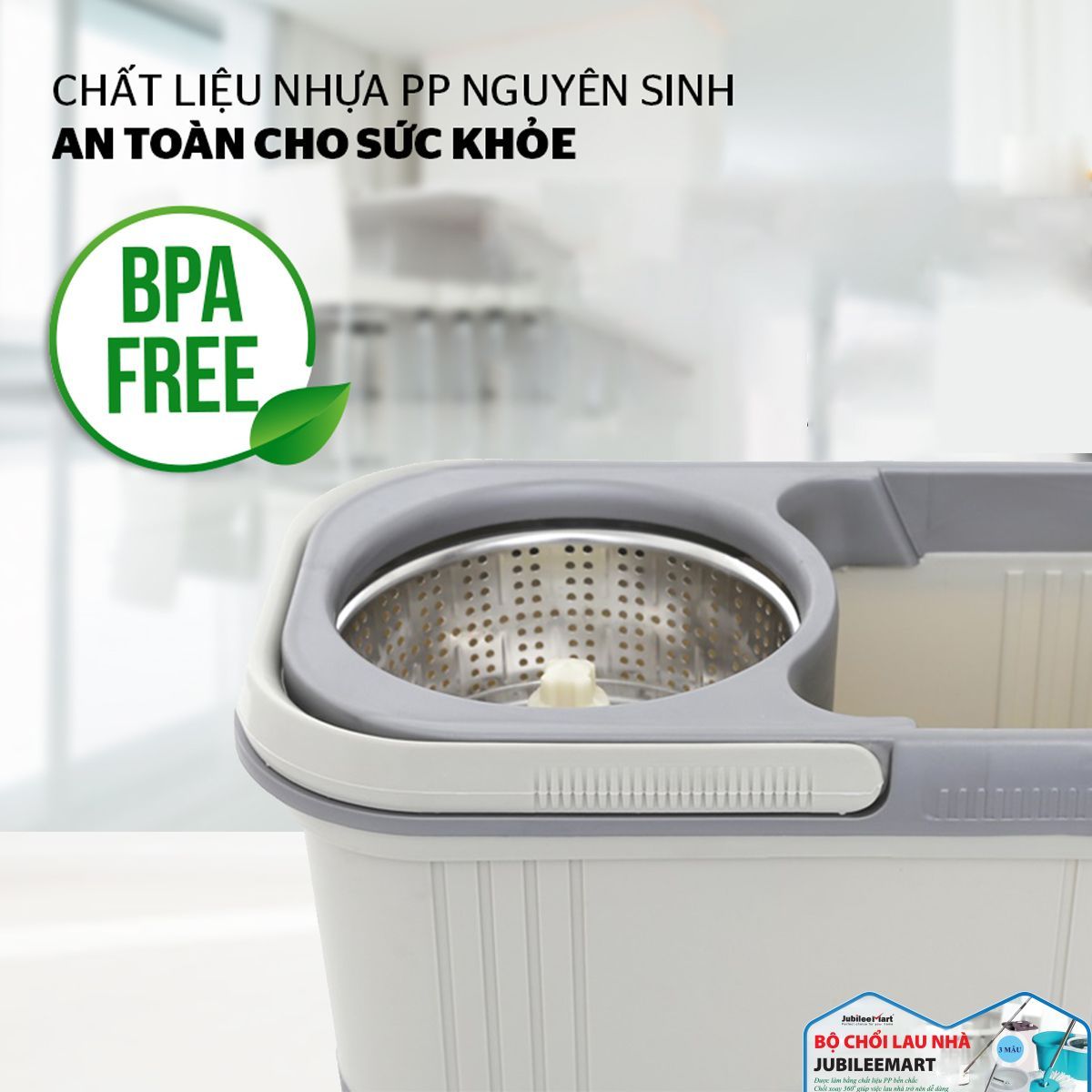 Thùng vắt được thiết kế gọn và cao, tiết kiệm diện tích và khi vắt không bị bắn nước ra ngoài. Chất liệu inox bền chắc và đẹp, xoay mượt với chỉ hai hoặc ba lần nhúng đầu lau xuống là đã nhanh chóng khô ráo mà bạn không cần phải dậm chân như những bộ lau nhà thông thường khác.