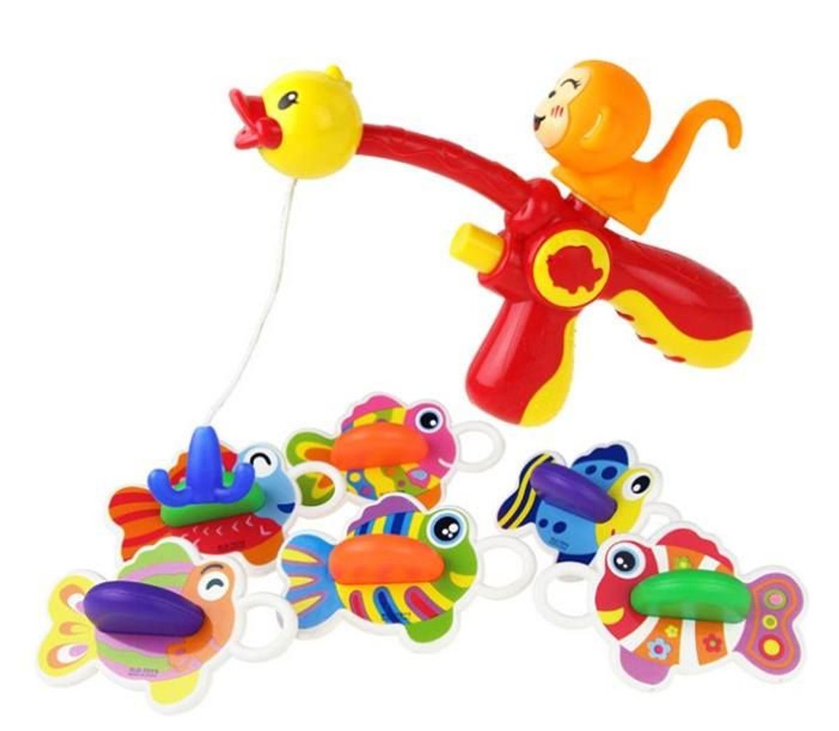 => Bộ gồm 1 cần câu cá vừa làm cần câu vừa làm súng phun nước. 6 con cá nhựa được thiết kế nổi cân bằng trên mặt nước. BÉ tha hồ ngồi vừa tắm vừa câu rèn luyện khéo léo, tập trung. 1 con khỉ vừa chơi vừa phun nước vừa làm đồ chơi bóp chút chít.