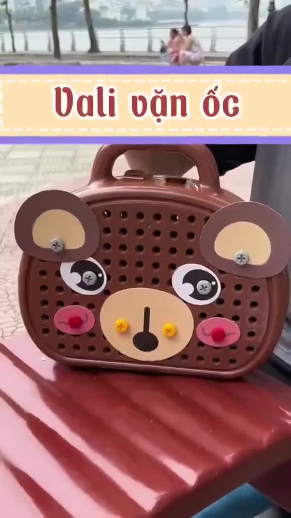 - 1 va li bằng nhựa hình gấu màu vàng đựng các chi tiết được đục lỗ để gắn ốc kích thước 27x24,5x7cm