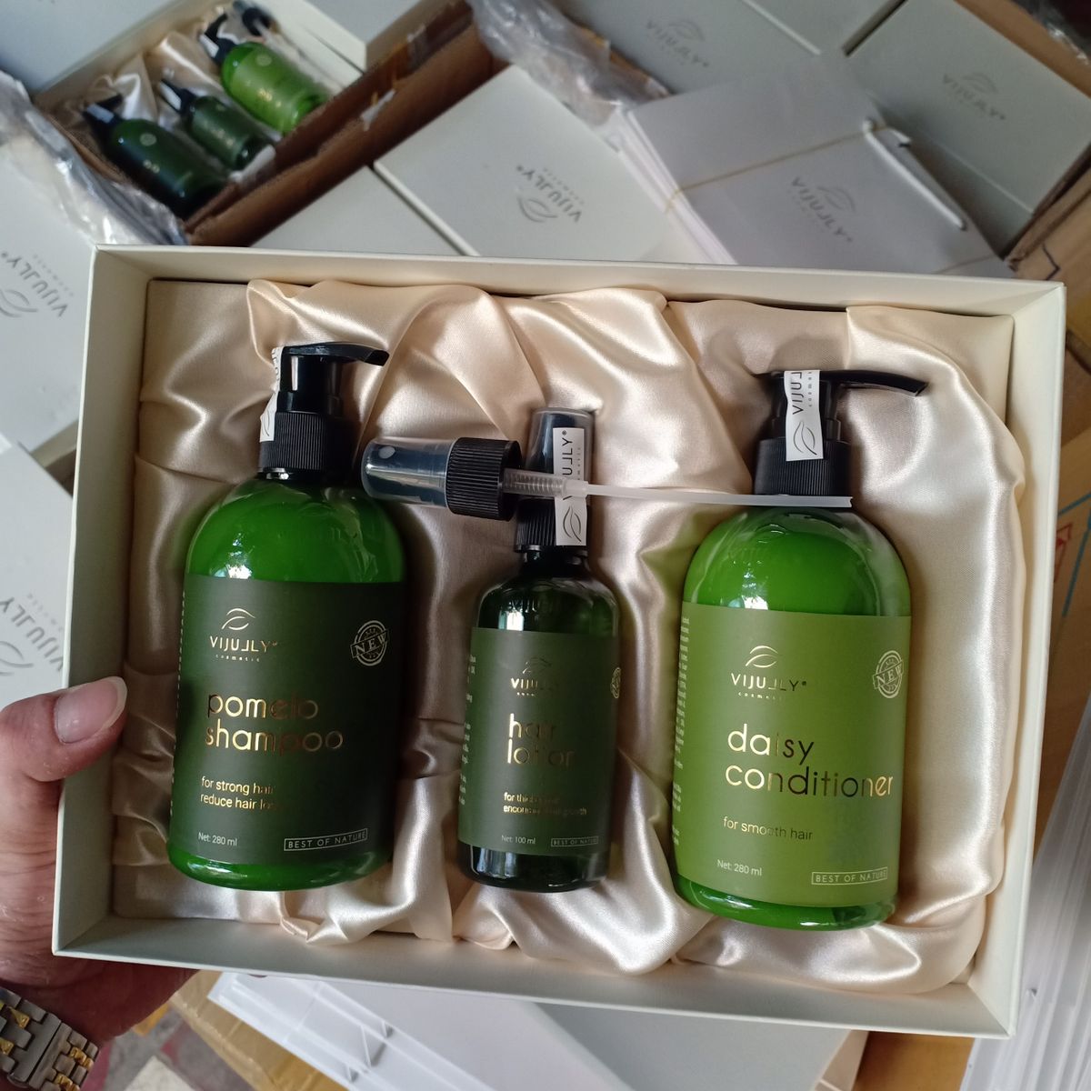 DẦU GỘI TINH DẦU BƯỞI VI JULLY COSMETIC Dầu gội tinh dầu bưởi - Từ trước đến nay, bưởi luôn là sự lựa chọn hàng đầu về chăm sóc ngăn ngừa sơ rụng, vậy bạn còn chần chừ gì nữa mà không thử chăm chút cho mái tóc với sản phẩm bên em? Tinh chất tinh dầu bưởi Ngăn ngừa rụng tóc Kích thích mọc tóc, nuôi dưỡng chân tóc Hiệu quả sau 5 ngày - 1 tuần sử dụng Dòng sản phẩm cao cấp ver 2018 của Vi Jully Hiệu Quả sau 2 tuần sử dụng Giá bán lẻ: 280.000đ giá niêm yết của công ty Thể Tích 280ml dùng hơn 3 tháng Hạn Sử Dụng 17/05/2021 Sản phẩm Thuộc Công Ty TNHH DV TM Mỹ Phẩm Vi Jully Hỗ trợ, tư vấn nhiệt tình Đối tượng sử dụng: Dùng cho các trường hợp rụng tóc nhiều và sau rụng tóc do các nguyên nhân: thay đổi nội tiết, lão hóa, sử dụng các loại thuốc, hóa chất, thiếu dinh dưỡng, làm việc căng thẳng, thay đổi nguồn nước, hoặc tóc rụng nhiều không có nguyên nhân những người tóc thưa, xơ, chẻ ngọn, tóc có nhiều dầu, người có nguy cơ hói đầu và bệnh nhân rụng tóc sau thời gian hóa trị, xạ trị ung thư,…