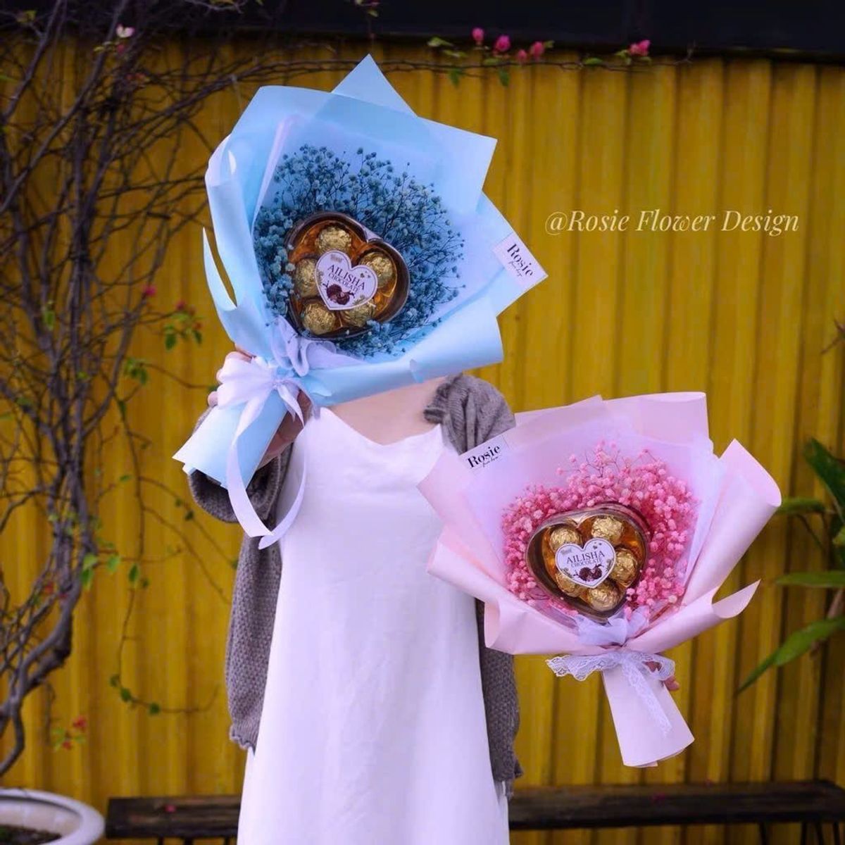 Bó hoa kẹo socola mix hoa baby phong cách Hàn Quốc làm quà tặng sinh nhật, 8/3, quà tặng ValentineQuà tặng sinh nhật, Valentine, 8/3 Bó hoa kẹo socola mix hoa baby khô độc đáo này này sẽ giúp bạn giải quyết vấn đề: nên mua hoa hay socola làm quà tặng 14/2 cho nửa kia của mình. Với sự chăm chút, tỉ mỉ của nhân viên nhà Rosie, chúng mình đảm bảo bạn sẽ nhận được một đóa hoa vừa có sắc, lại vừa có vị. Không chỉ là quà tặng cho ngày lễ tình yêu, bó hoa này cũng rất phù hợp làm quà tặng 8/3 hay quà tặng sinh nhật.Kích thước: 40x32cmMột bó hoa kẹo socola bao gồm1 Hộp kẹo socola 5 viên.Hoa baby trang trí theo tone màu bó hoa kẹo socola Tặng kèm thiệp và túi đựng hoa theo phong cách Hàn QuốcCác sản phẩm sử dụng đều đảm bảo chất lượng và an toàn với người sử dụng.