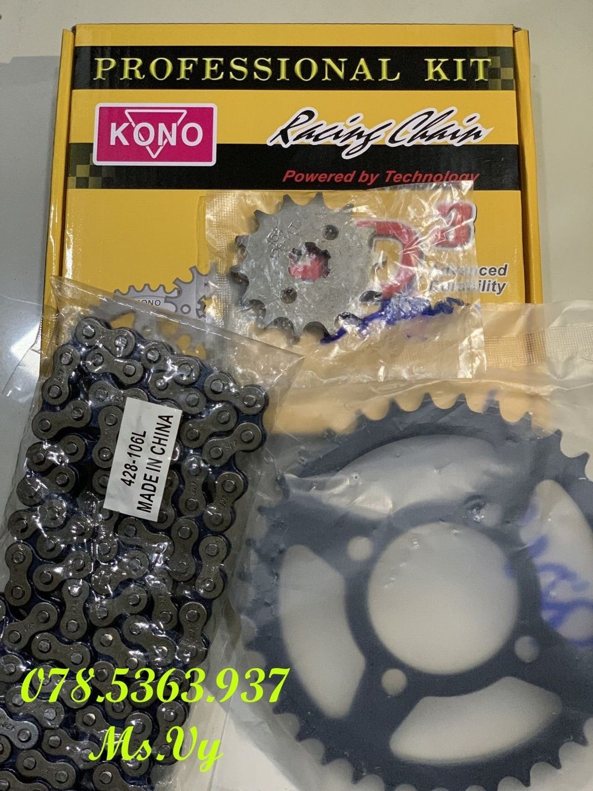 1. Thông tin chi tiết: 428Hx102L (sên 10ly) hoặc 428x102L (sên 9ly), nhông 14T (14 răng), dĩa 36T (36 răng), thép C45.