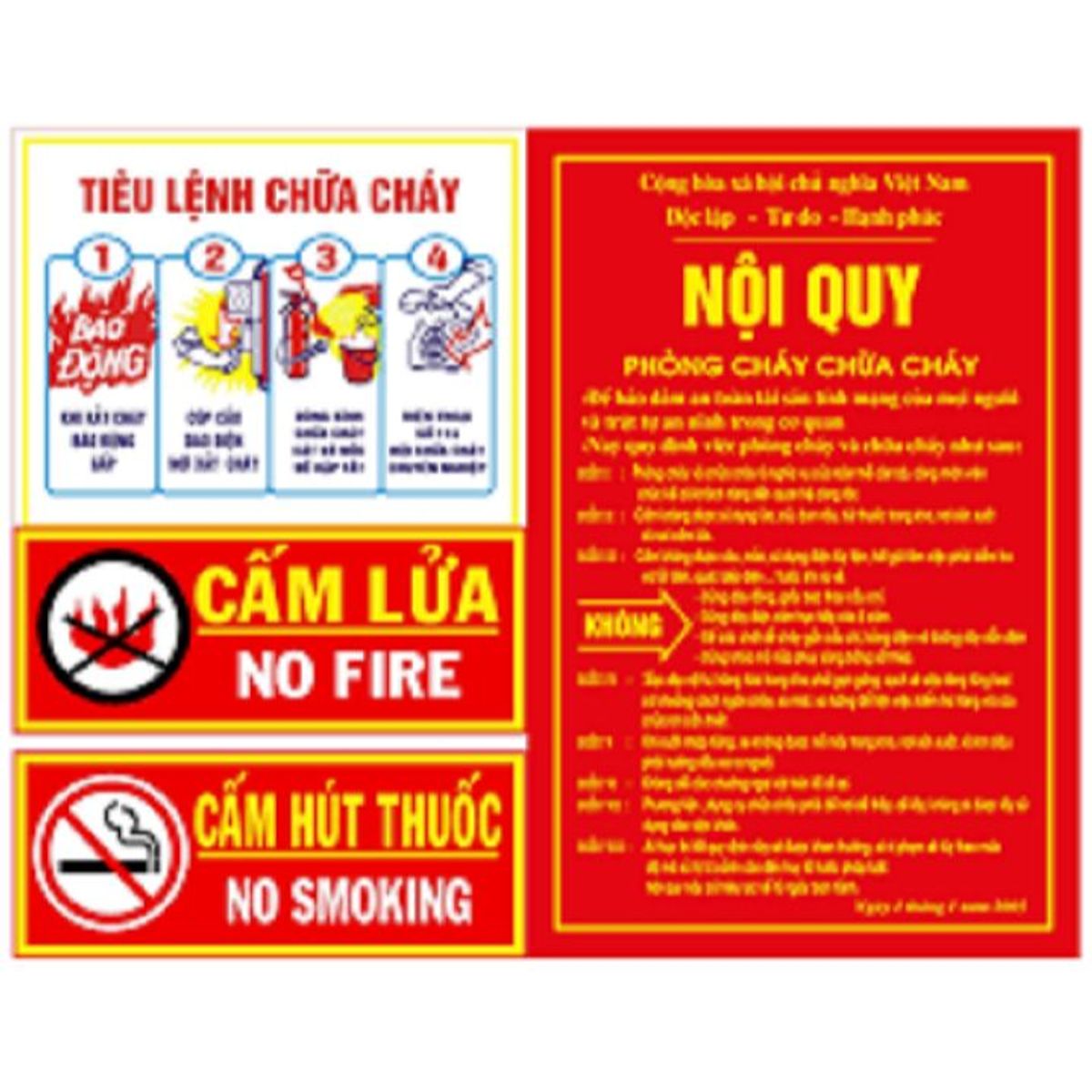 Bộ nội quy tiêu lệnh gồm 04 tấm: 1.Nội quy phòng cháy 2.Tiêu lệnh chữa cháy 3.Bảng cấm hút thuốc 4.Bảng cấm lửa KÍCH THƯỚC CHUẨN BỘ NỘI QUY TIÊU LỆNH PHÒNG CHÁY CHỮA CHÁY => Tiêu lệnh chữa cháy: 32(cm) x 44(cm) => Cấm hút thuốc: 18(cm) x 40(cm) => Cấm lửa: 18(cm) x 40(cm) => Nội quy PCCC: 32(cm) x 44(cm) - Chất liệu: Tôn sắt chông gỉ Mẫu bộ nội quy tiêu lệnh gồm 04 tấm. Bộ Tiêu lệnh phòng cháy chữa cháy là một thiết bị PCCC cung cấp đầy đủ thông tin thực hiện tốt việc phòng cháy chữa cháy, nó mang tính cảnh báo, giúp hạn chế phòng ngừa nguy cơ cháy nổ có thể xảy ra. Mỗi cơ quan đoàn thể, công ty nên có một bộ nội quy tiêu lệnh giúp phòng ngừa rủi ro khi xảy ra cháy nổ, giảm bớt những thiệt hại về người và của cho toàn thể cộng đồng. * QUÝ KHÁCH LƯU Ý TRÁNH CHỌN NHẦM TẤM LẺ VÀ BỘ NHÉ !