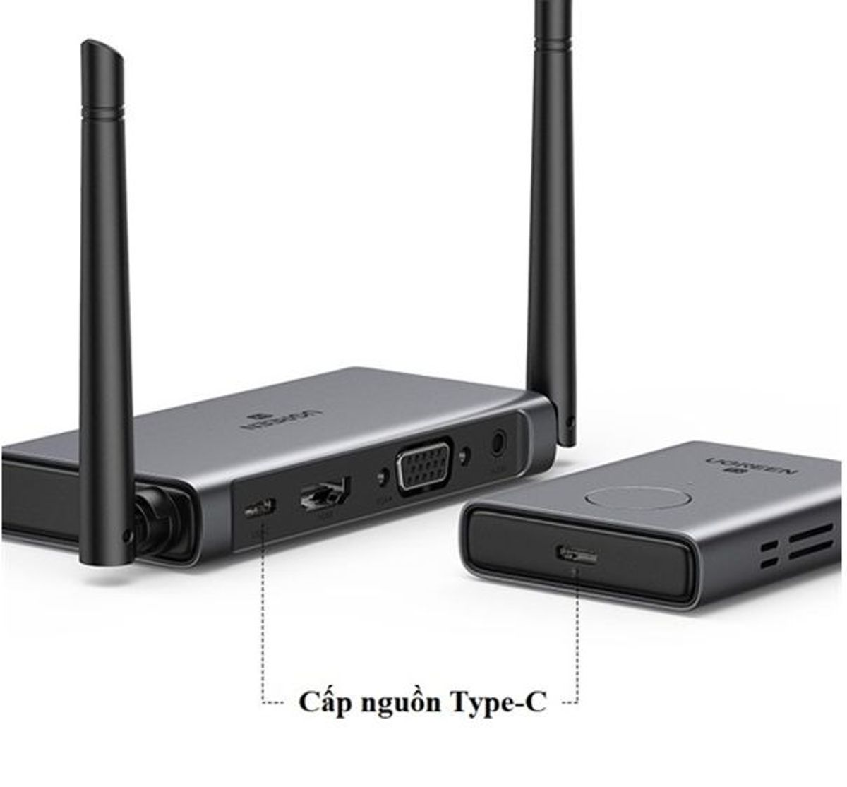 2. Bộ thu phát: 1 × HDMI, 1 × VGA, 1 × USB-C, 1 cấp nguồn × 3,5mm Âm thanh