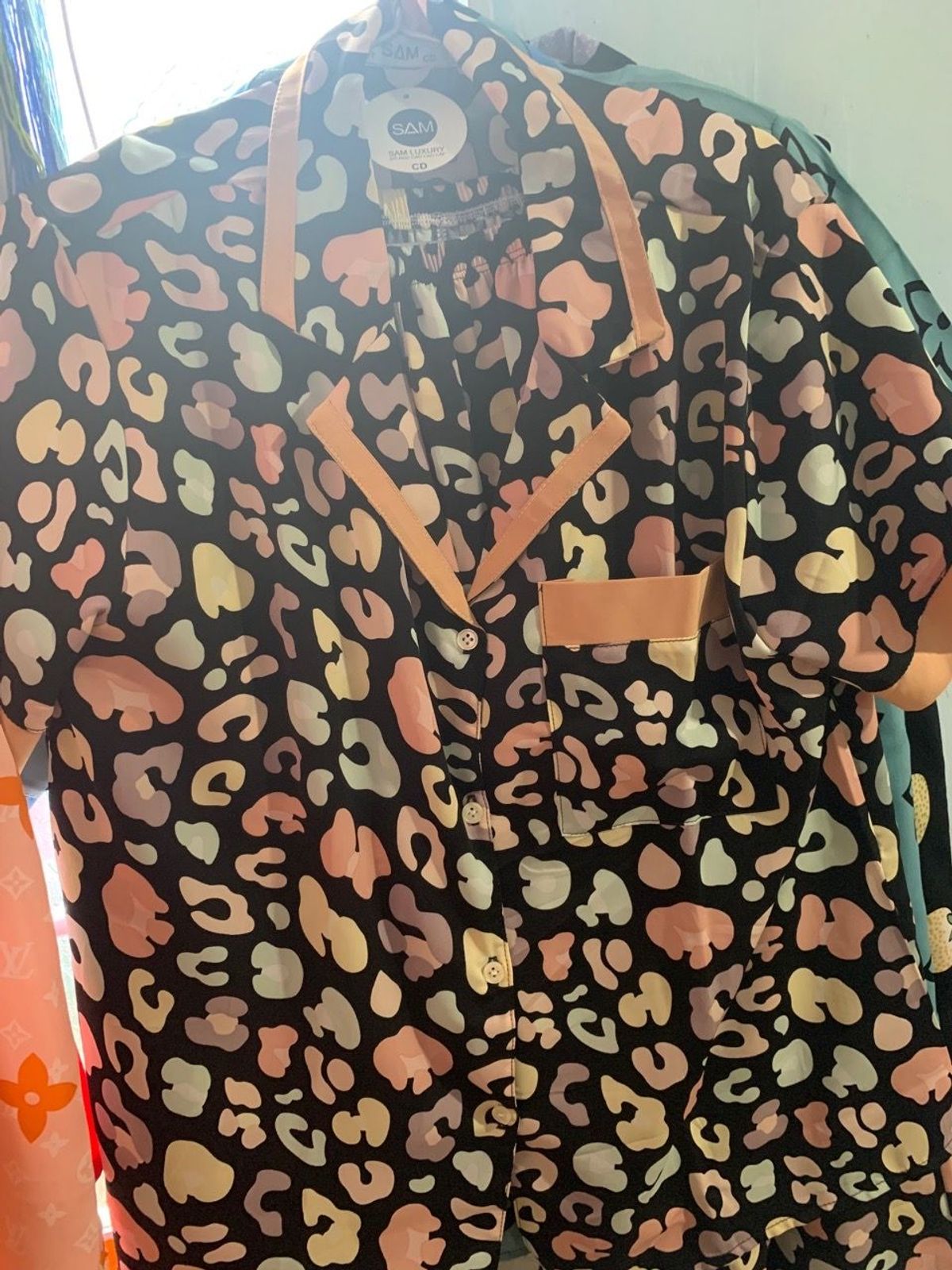 + Quần dài ống suông rộng cạp thun, mặc cùng áo sơ mi dáng suông, tay ngắn, cổ vest bẻ cùng hàng nút giữa, là nét đặc trưng của Pijama.