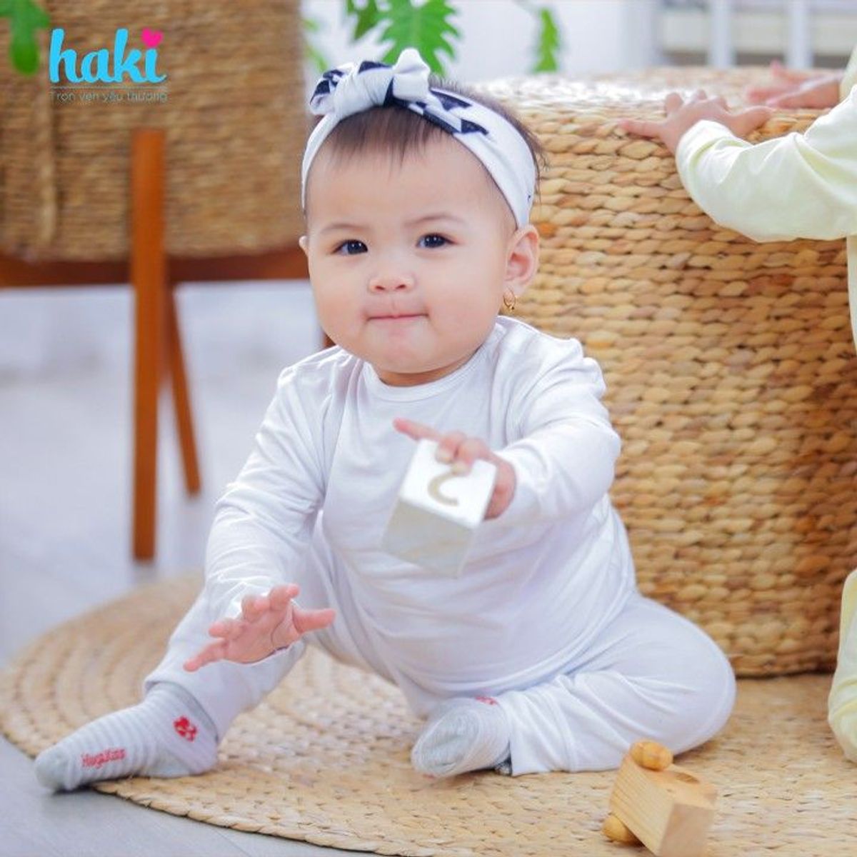 Bộ dài tay cài vai vải Modal cao cấp của Haki thấm hút, thoáng mát, chất vải không siêu mềm, nhẹ, mát nên phù hợp cho bé mặc 4 mùa.