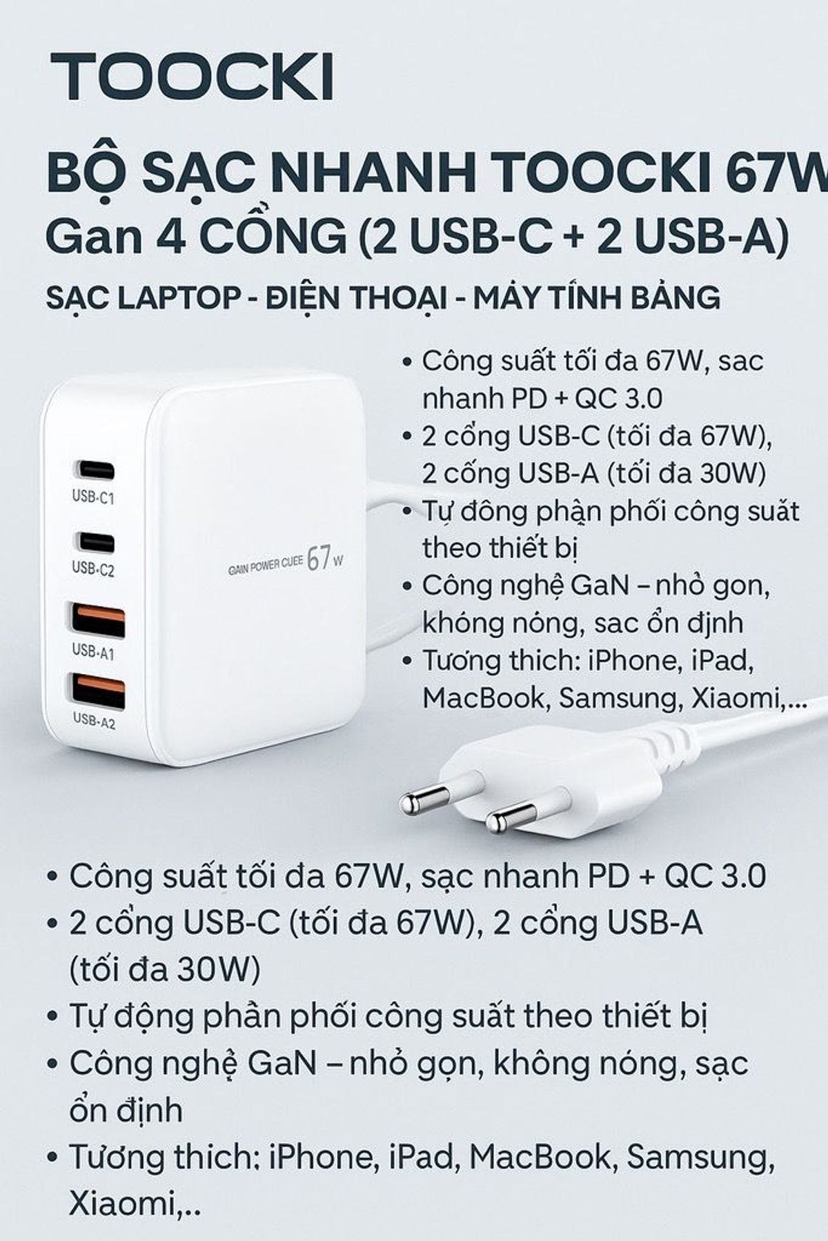 Bộ Sạc Nhanh TOOCKI 67W GaN 4 Cổng giá sỉ - giá bán buôn