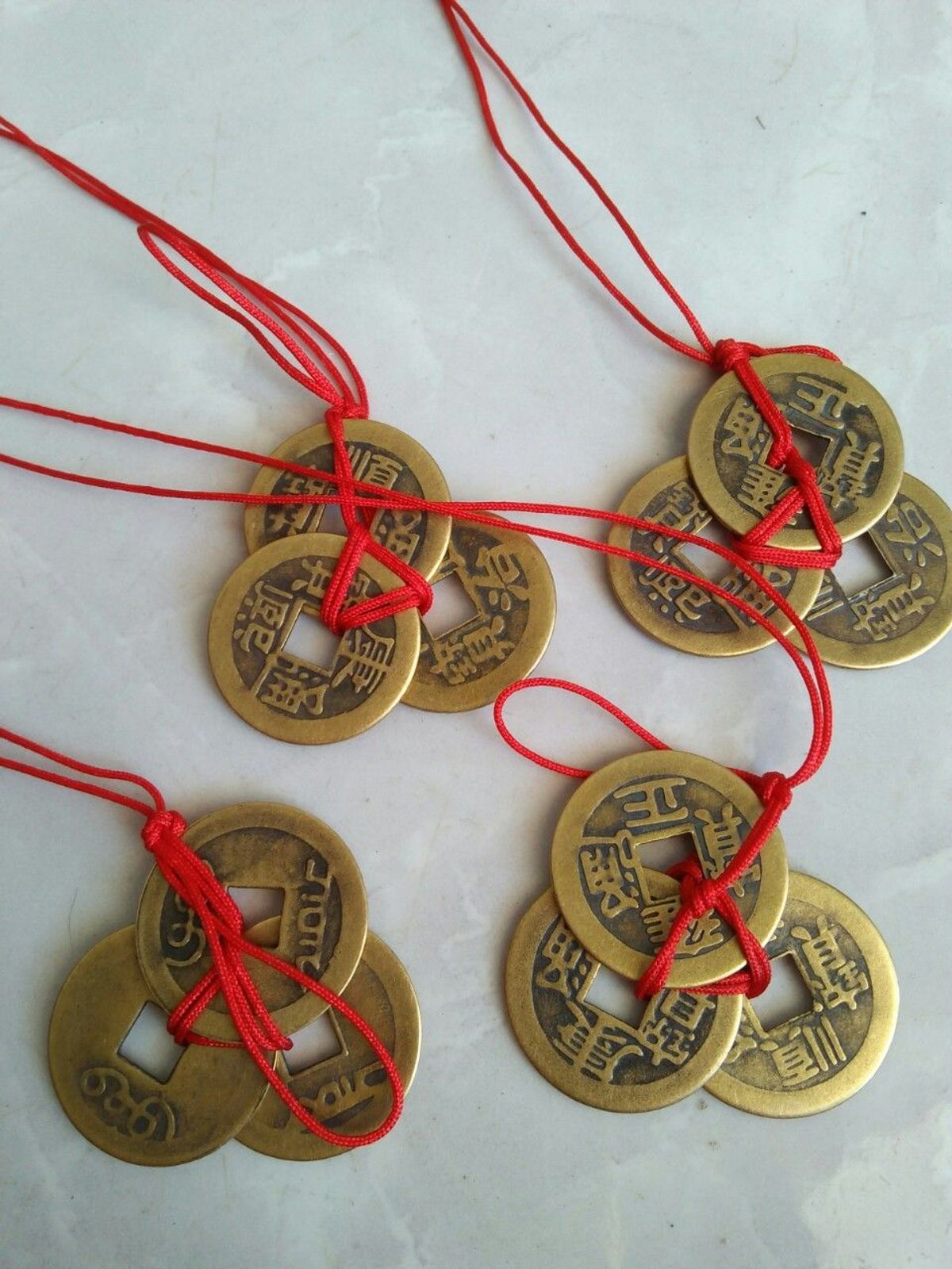 - Bạn cần chuẩn bị 3 đồng xu phong thủy, dây ruy băng màu đỏ nhất định phải là màu đỏ nhé. Sau đó bạn lồng 3 đồng xu này vào dây ruy băng, khéo léo buộc chúng lại, nhớ buộc vừa tay đừng siết quá chặt.