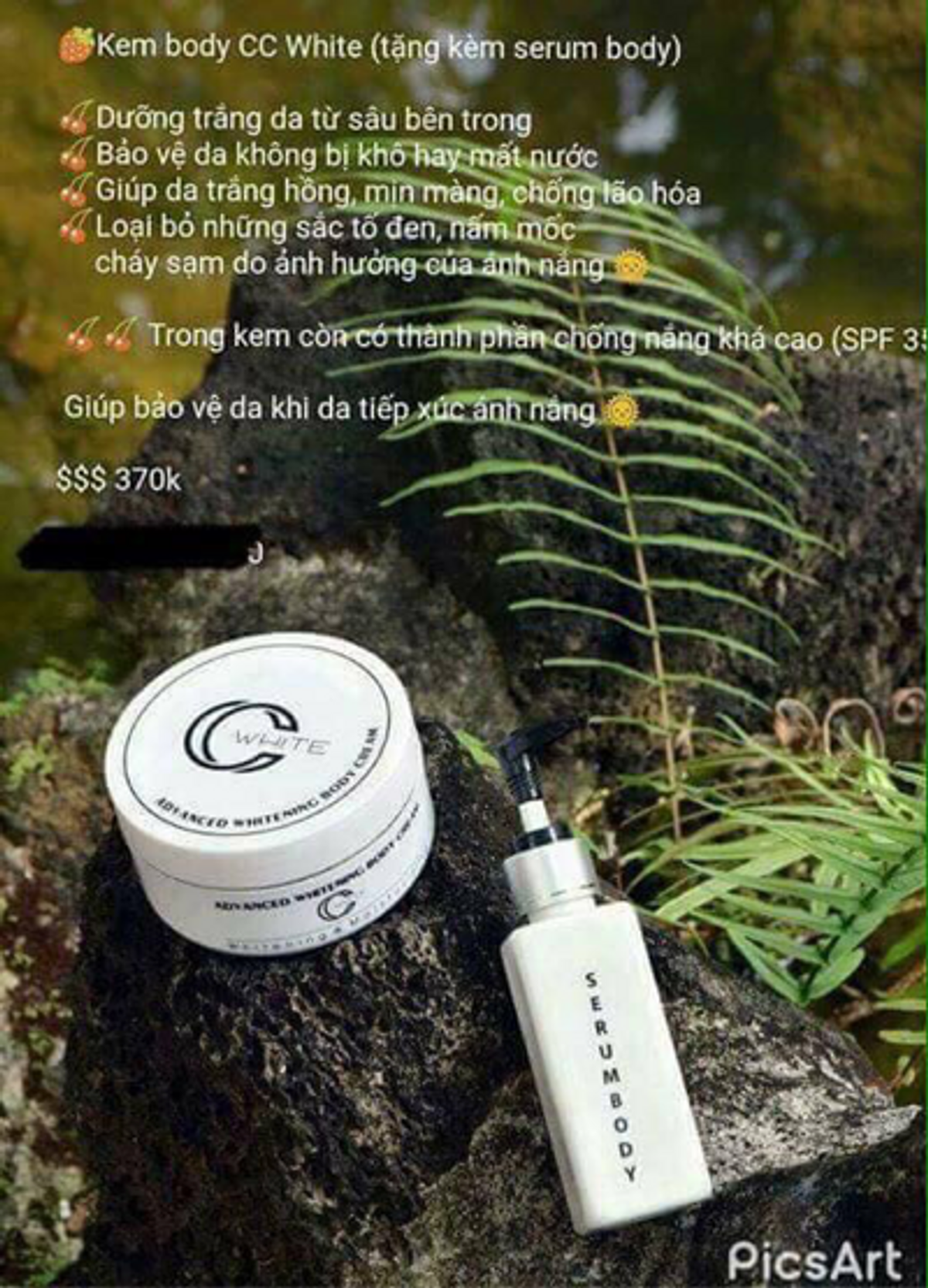 KEM BODY CC WHITEThoa tới đâu thấm tới đó, cực kì khô ráo không bết rít khó chịu, ko lộ vân kem. Cung cấp độ ẩm, giúp da luôn mềm mịn ko bị khô da vs thời tiết hanh khô. Làm lớp make up nhẹ khi đi tiệc, đi ra ngoài. Giúp da trắng hồng, mịn màng và khoẻ từ sâu bên trong. Chất kem sệt, mát lạnh, siêu thẩm thấu ko làm bí tắc lỗ chân lông. Mùi thơm nhẹ dịu sang trọng. ️️HÃY DÙNG VÀ CẢM NHẬN Giá niêm yết : 370K/ 250gr tặng 1 body lotion kích trắng nhanh và chống nắng .
