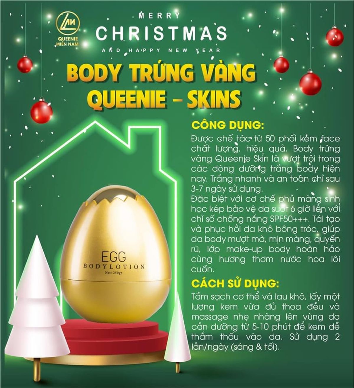 BODY TRỨNG : Được chiết xuất từ lòng đỏ trứng gà , tinh chất ngọc trai , thảo dược , vitamin cùng hương thơm sang trọng . Giúp dưỡng trắng da hoàn hảo , đồng thời đóng vai trò như 1 lớp bảo vệ da toàn thân với chỉ số chống nắng cao đến SPF 50++ . Ngoài ra kem còn có thể sử dụng làm kem nền cho body , makeup nhẹ nhàng nhưng hiệu quả dưỡng trắng vượt bậc cho body .