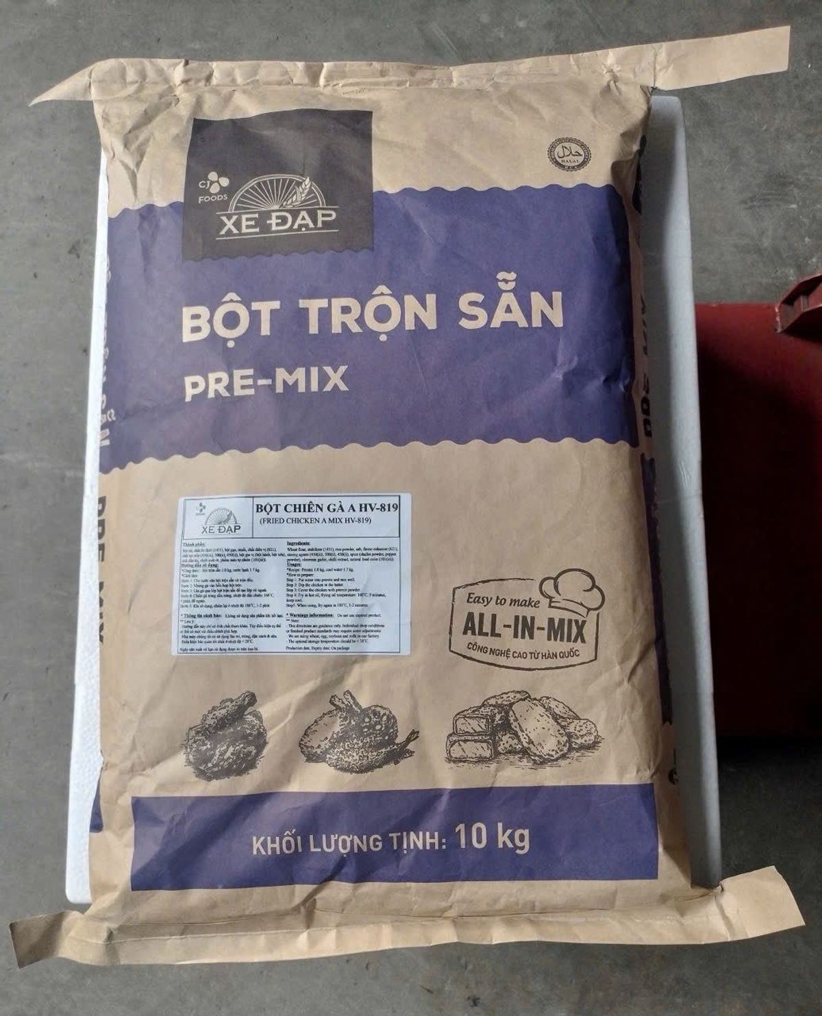 Bột chiên gà rán HV-819 thương hiệu Xe Đạp – túi 10KG, trộn sẵn, tiện lợi cho các quán ăn, nhà hàng, bếp công nghiệp.Đây là dòng bột chiên được sản xuất theo công nghệ Hàn Quốc, không cần pha thêm, chỉ cần áo bột là có thể chiên ngay.