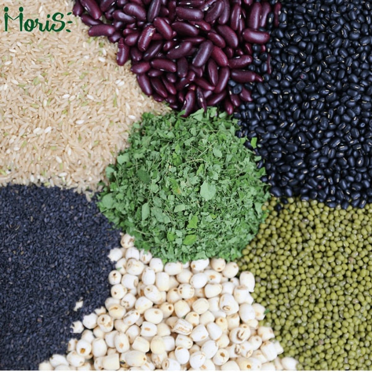Bột ngũ cốc MORIS là sự kết hợp giữa những loại ngũ cốc giàu dinh dưỡng của người dân Việt như gạo lứt, đậu đỏ, đậu xanh, hạt sen, mè đen… và bột chùm ngây sấy lạnh do Chùm Ngây Việt sản xuất.
