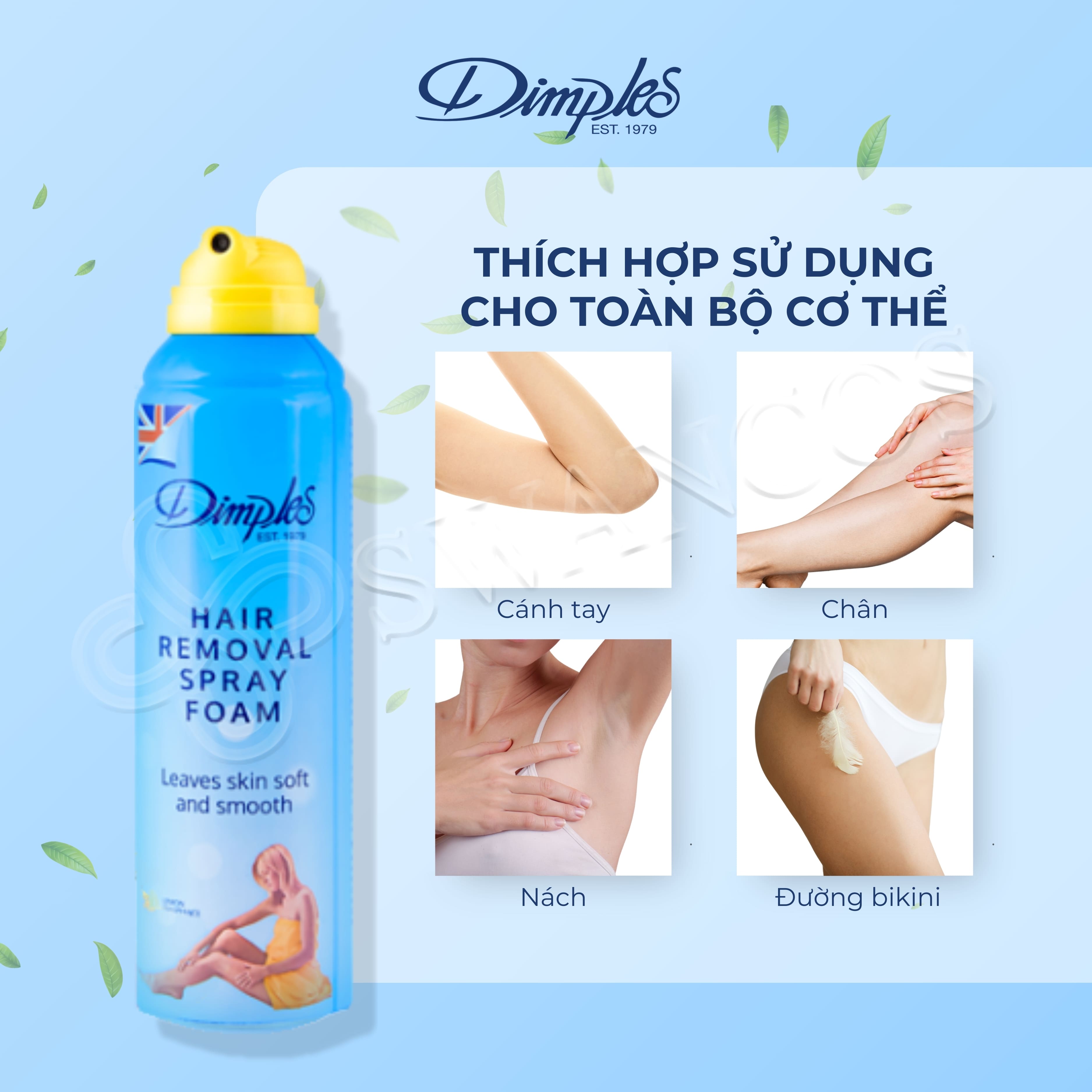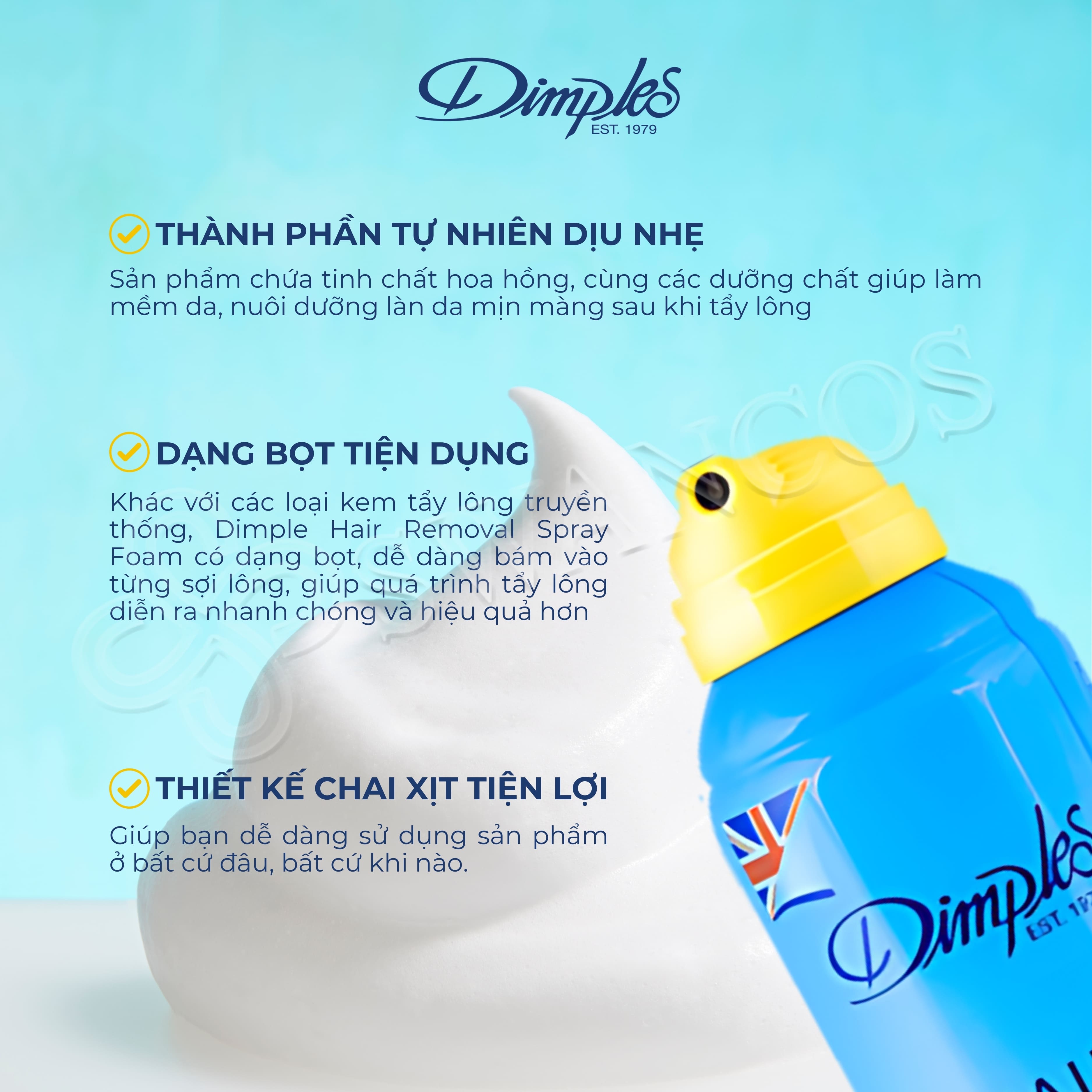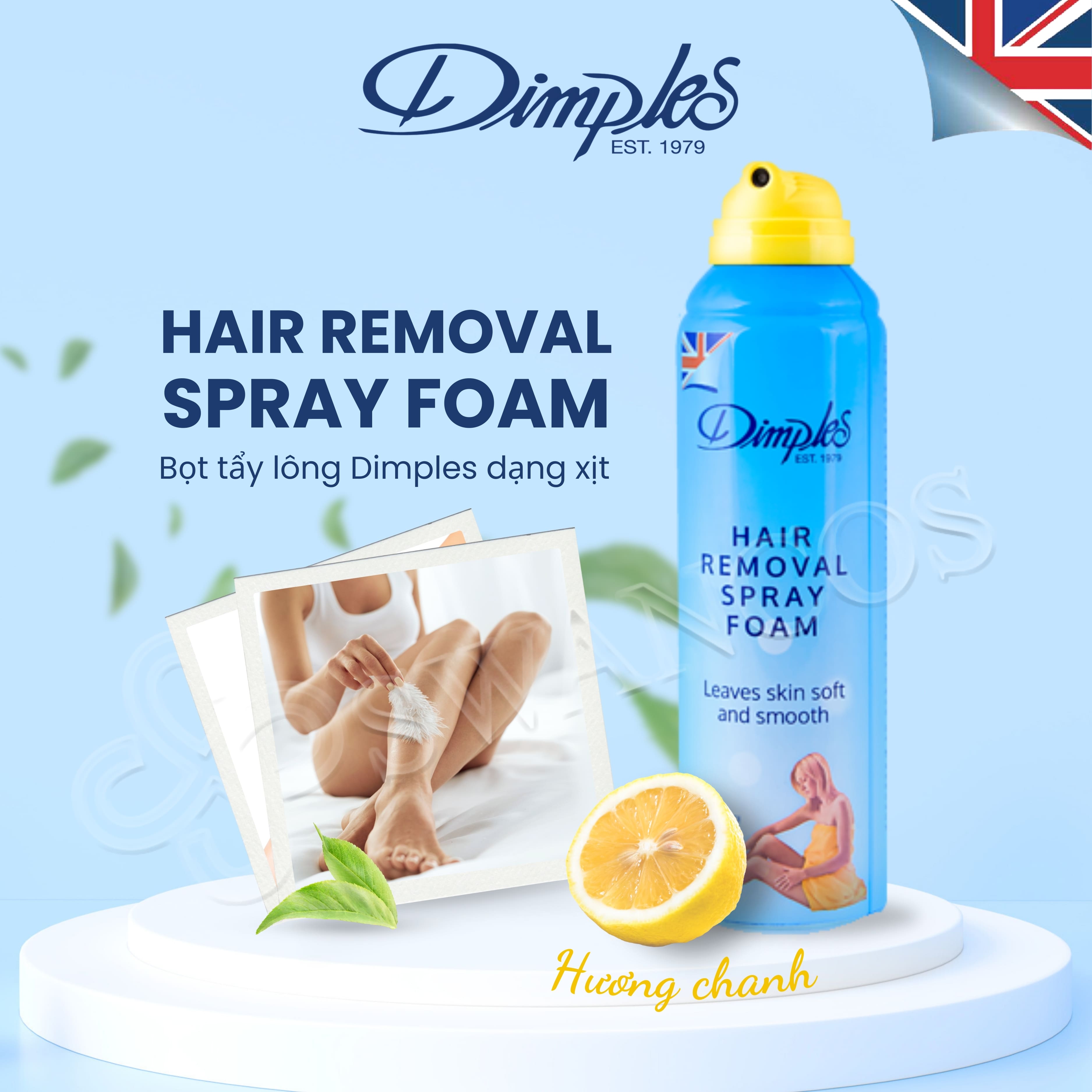 Dimples Hair Remover Spray Foam là giải pháp hiện đại dành cho những người bận rộn muốn chăm sóc cơ thể một cách nhanh chóng, tiện lợi và an toàn. Với thiết kế dạng xịt bọt, sản phẩm giúp phân bố đều trên da, bám chắc vào từng sợi lông, mang lại hiệu quả tẩy lông nhanh chóng chỉ trong vài phút mà không gây đau, không gây kích ứng da.
