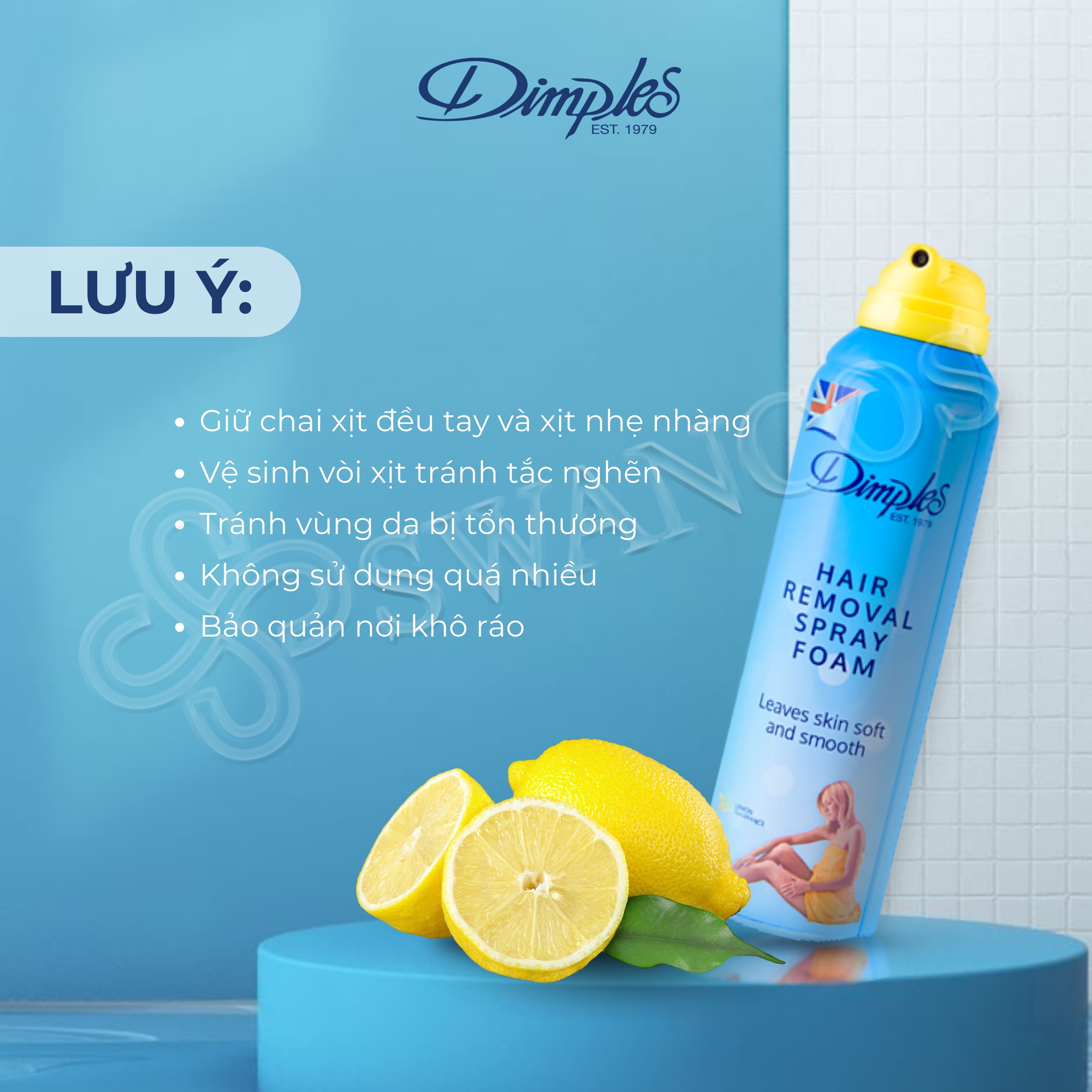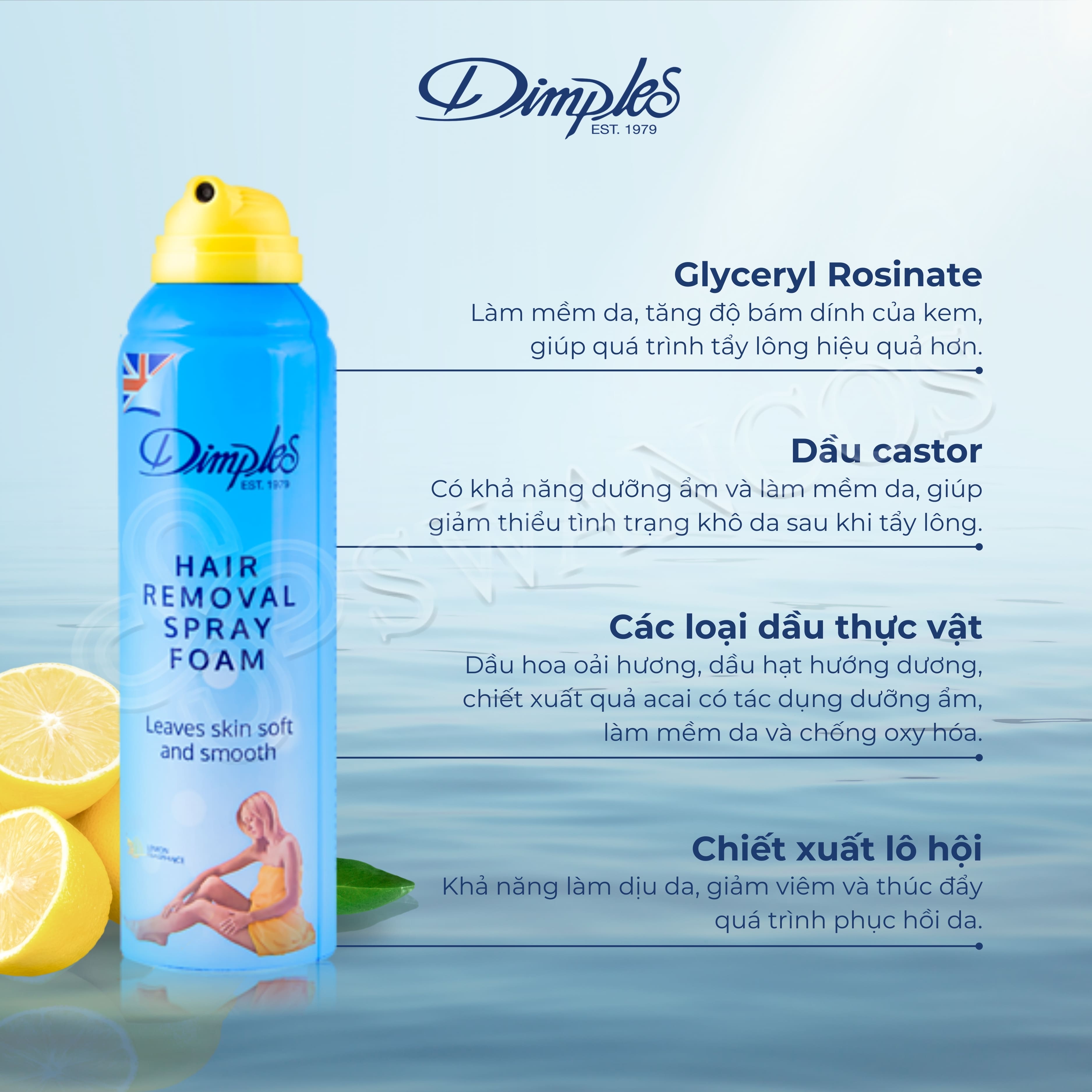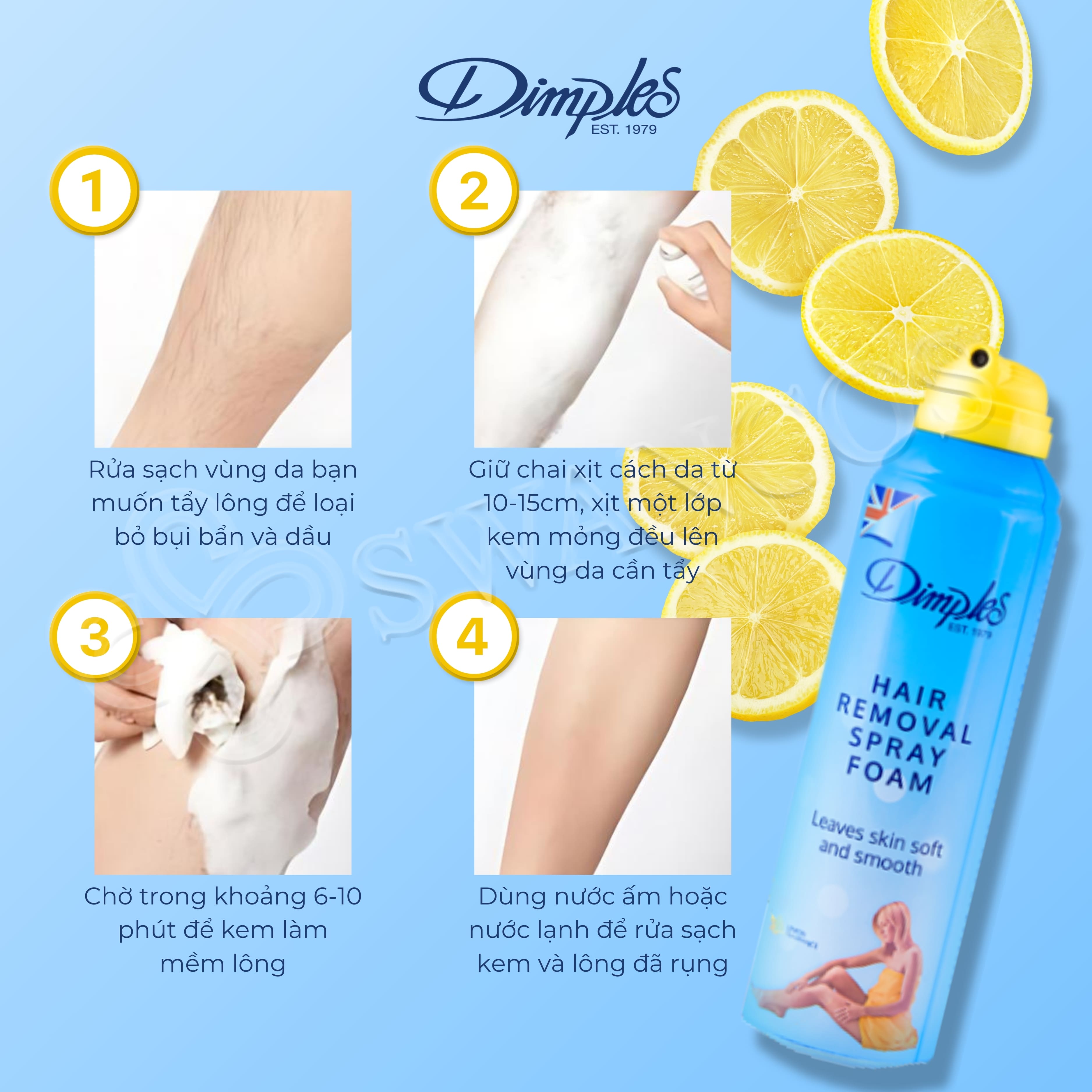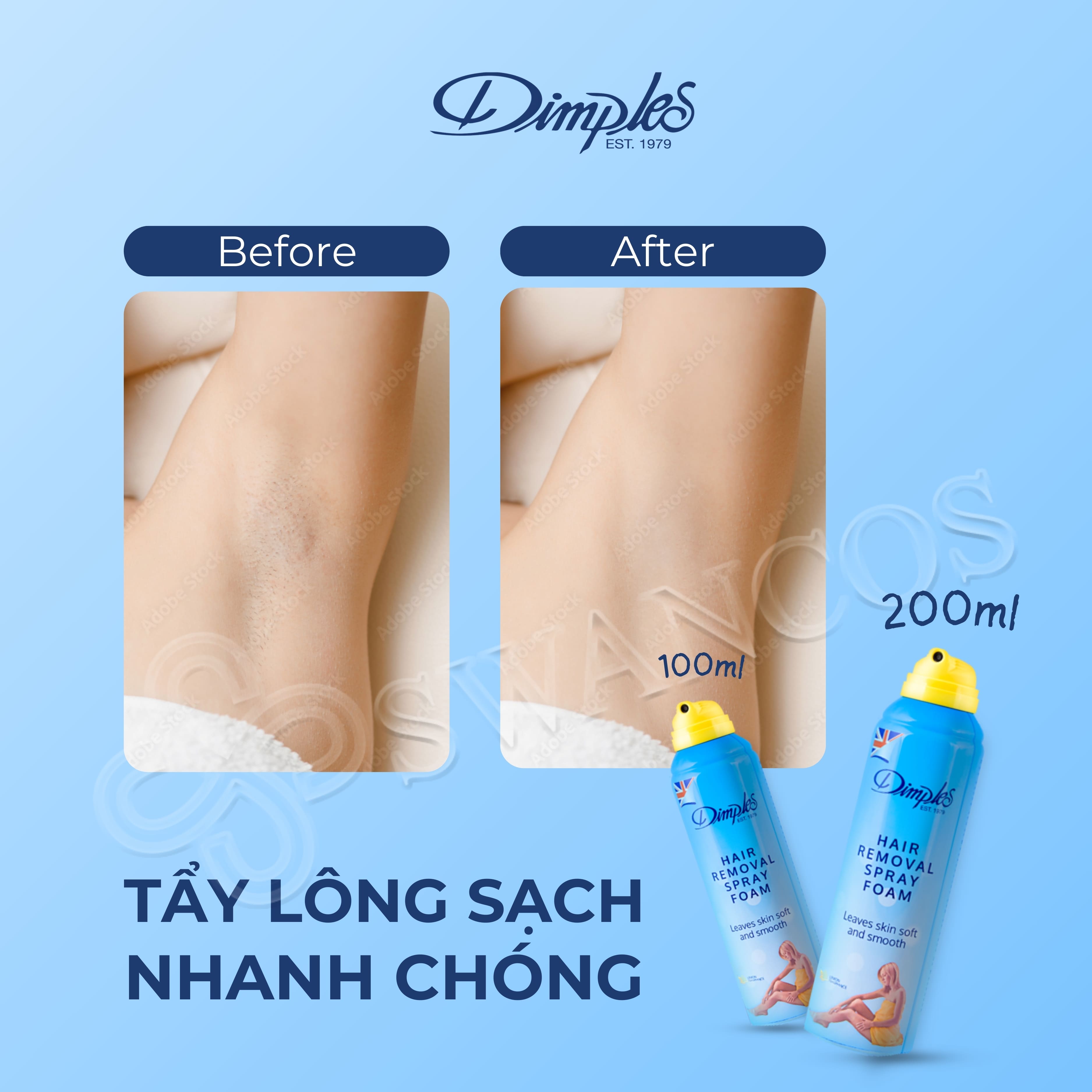 Dimples Hair Remover Spray Foam là giải pháp hiện đại dành cho những người bận rộn muốn chăm sóc cơ thể một cách nhanh chóng, tiện lợi và an toàn. Với thiết kế dạng xịt bọt, sản phẩm giúp phân bố đều trên da, bám chắc vào từng sợi lông, mang lại hiệu quả tẩy lông nhanh chóng chỉ trong vài phút mà không gây đau, không gây kích ứng da.