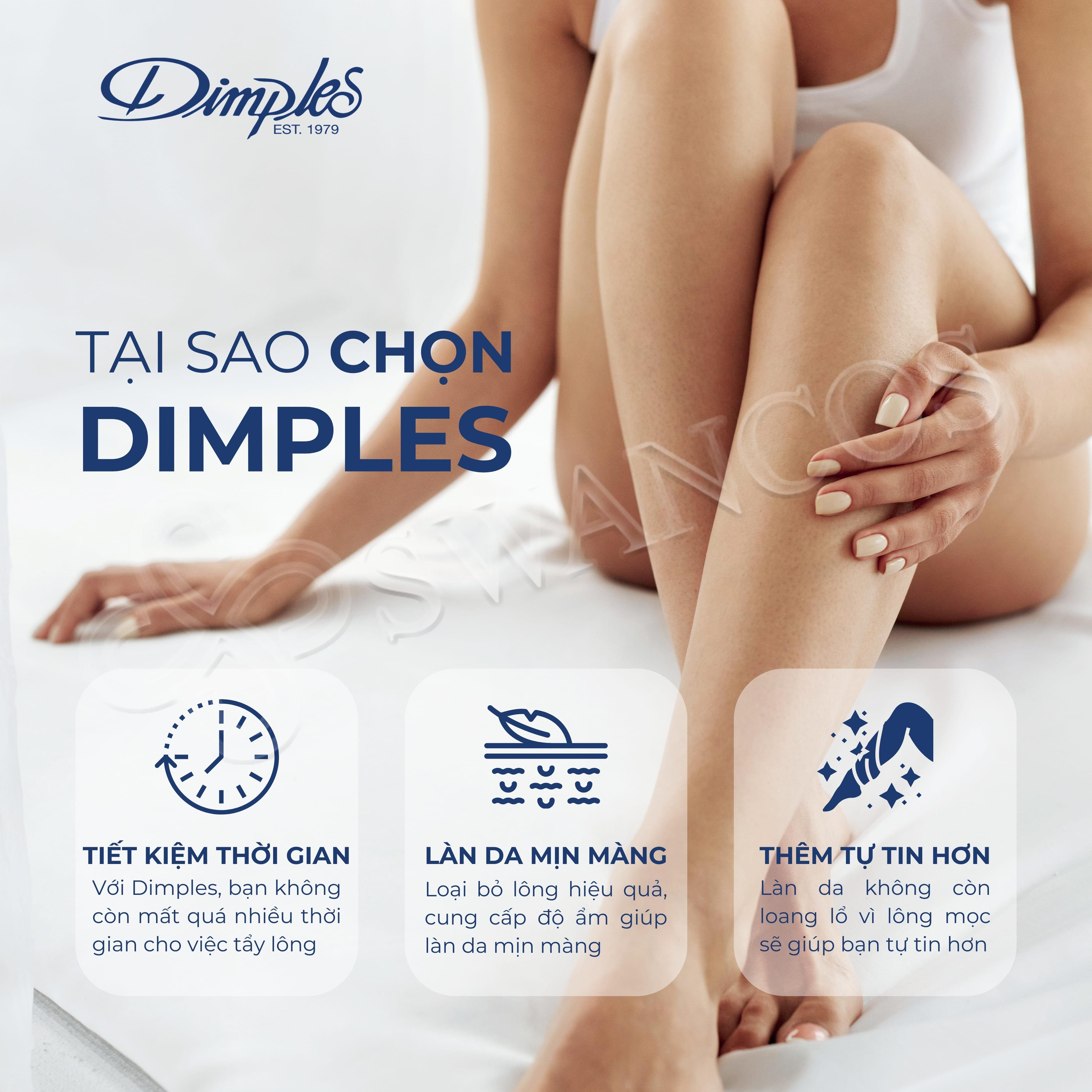 Dimples là thương hiệu chăm sóc cá nhân uy tín đến từ Anh Quốc, với hơn 30 năm kinh nghiệm trong lĩnh vực tẩy lông và chăm sóc da. Tất cả sản phẩm Dimples đều được sản xuất tại Linco House, Manchester Road, Carrington Manchester, Anh và tuân thủ tiêu chuẩn chất lượng nghiêm ngặt châu Âu.