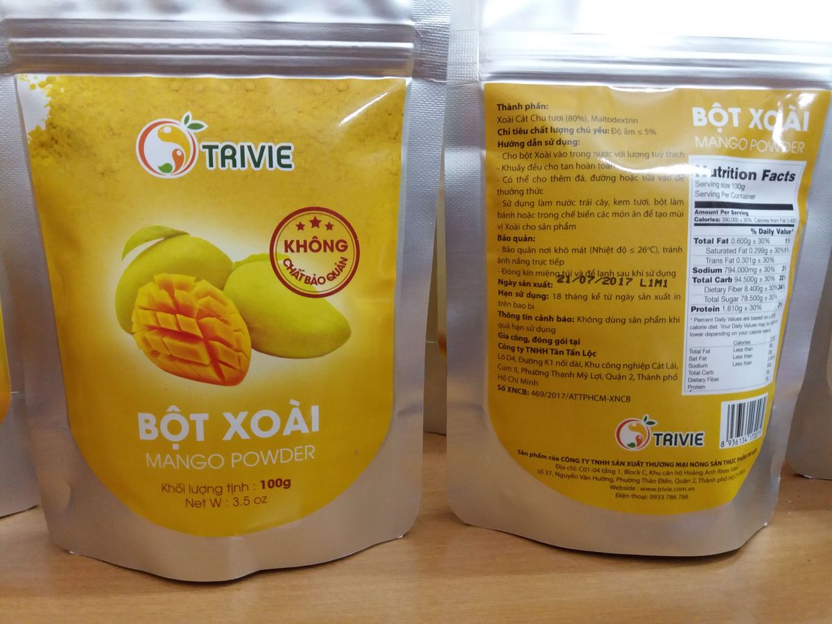 Thông tin sản phẩm: Bột Xoài nguyên chất - Trivie do Công ty TNHH Sản xuất Thương mại Nông sản Thực phẩm Trí Việt. : . Sản xuất bằng nguồn nguyên liệu sạch, trên dây truyền công nghệ tiến tiến nhất thuộc nhóm công nghiệp G7. Đảm bảo các chỉ tiêu trong nước và Quốc tế - Bột Xoài dạng bột, màu vàng nhạt. Mùi,vị thơm tự nhiên của trái Xoài tươi. Chứng nhận ATVSTP, sản phẩm đạt tiêu chuẩn ISO HACCP - Xuất xứ: Việt Nam - Công dụng: Dùng pha nước, sinh tố uống trực tiếp. Sử dụng để chế biến các thức uống, trong nghành công nghiệp thực phẩm, dược phẩm và mỹ phẩm., phụ gia làm bánh, kẹo, kem...Quy cách đóng gói: Túi 100g 200g 500g hoặc theo yêu cầu của khách hàng. Thời gian sử dụng:18 tháng, kể từ ngày sản xuất.