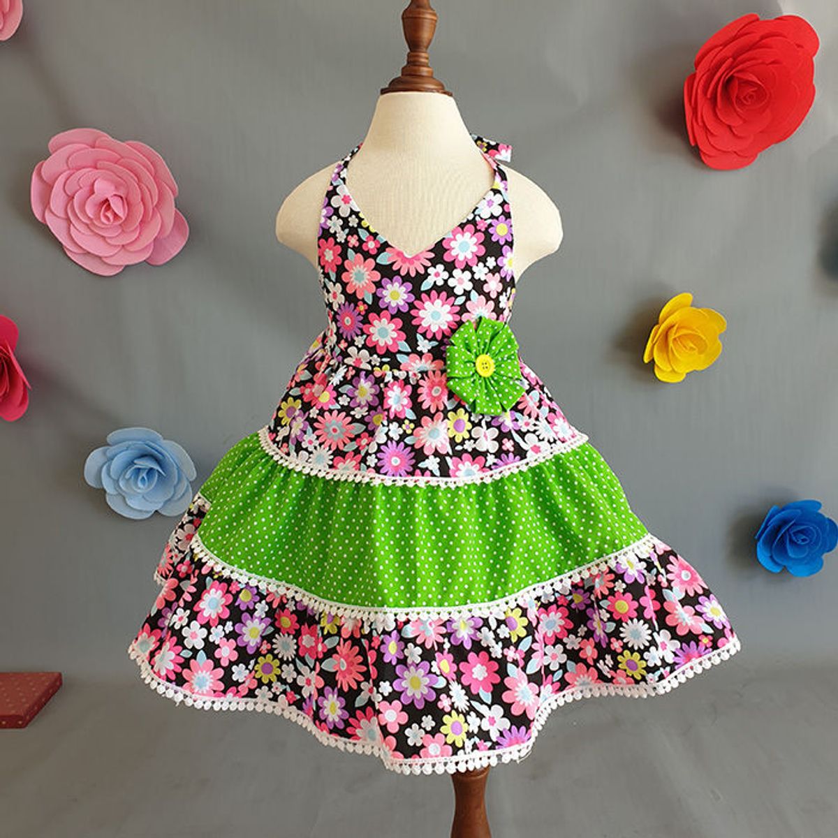 Chất liệu kate in hoa nổi. Lớp lót bằng vải cotton 100% thấm hút tốt. Thiết kế mát mẻ, 3 tầng bèo xòe nổi bật, giúp bé luôn nổi bật giữa đám đông.