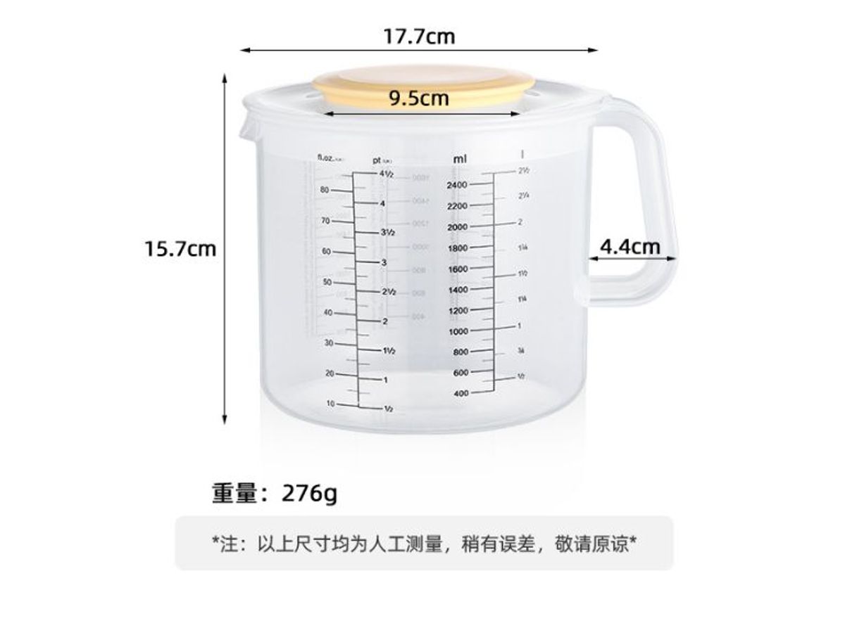 Chất liệu nhựa bền bỉ, dễ vệ sinh, kết hợp với nắp đậy chắc chắn giúp bảo quản thực phẩm lâu dài mà không lo bị rò rỉ. Các vạch chia rõ ràng giúp bạn dễ dàng đo lường chính xác lượng nguyên liệu, từ việc đánh trứng đến trộn kem cheese cho món bánh hoàn hảo.