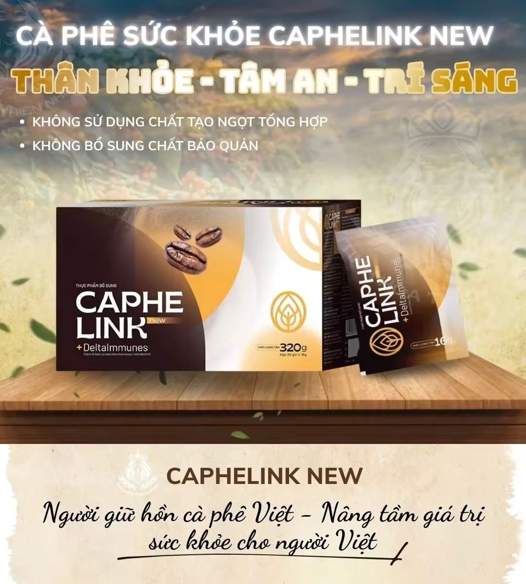 Nâng tầm hạt cà phê Việt không chỉ ở hương vị mà còn ở giá trị sức khỏe, Caphelink New ra đời từ sứ mệnh to lớn: "Chung tay xây dựng cộng đồng khỏe và giàu". Chúng tôi khát vọng liên kết mọi người Việt Nam, chắt lọc tinh hoa thảo dược quê hương để tạo nên một sản phẩm mang đậm niềm tự tôn dân tộc. Uống một ly Caphelink mỗi sáng không chỉ là thưởng thức cà phê, mà là bạn đang trao gửi niềm tin và xây dựng sự thịnh vượng chung của cộng đồng.