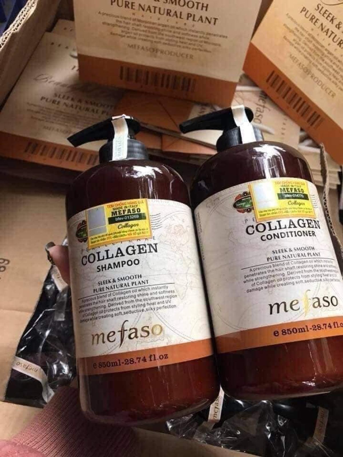 Bộ dầu gội xả Collagen Mefaso giúp bổ sung độ ẩm, tăng sự đàn hồi, dẻo dai của sợi tóc.
