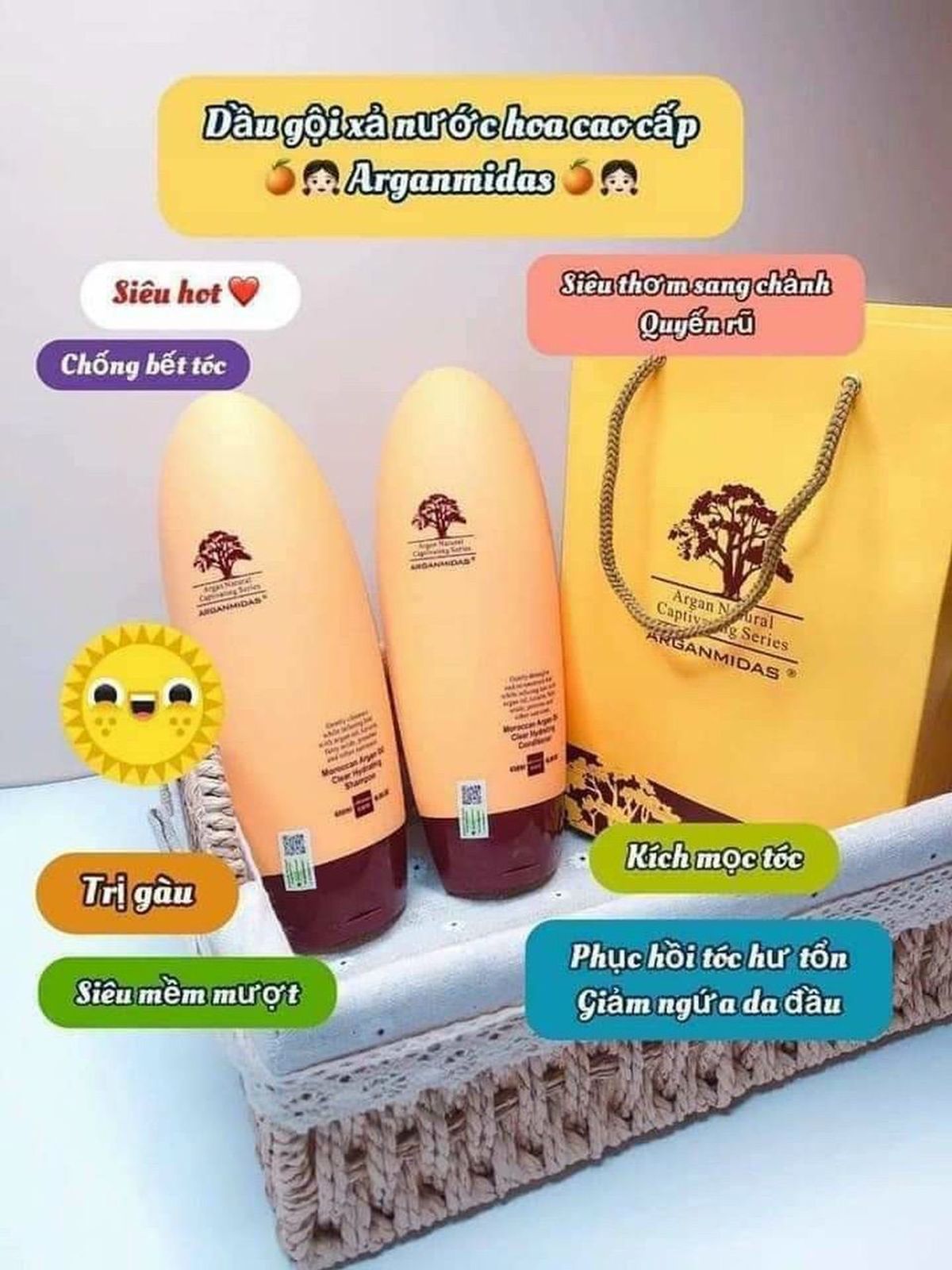 CẶP DẦU GỘI XẢ ARGANMIDAS SIÊU MỀM MƯỢT PHỤC HỒI TÓC CANADA 450ML Sĩ 270kSl giảmThuộc dòng chăm sóc tóc khô, phục hồi tóc hư tổn, làm mềm mượt và bóng đẹp. Với mùi hương quyến rũ sexy là những ưu điểm khiến chị em say mê arganmidas Dòng sản phẩm cao cấp Arganmidas nhập khẩu từ Canada với thành phần dầu Argan sẽ giúp bạn có được mái tóc bóng khỏe, suôn mượt. Với tính năng phục hồi vượt trội, mang lại sức sống cho cả những mái tóc khô sơ nhất hoặc tóc bị hư tổn do sử dụ ng hóa chất uốn, ép, nhuộm màu. Dầu gội và dầu xả ARGANMIDAS nhẹ nhàng tẩy sạch gầu và bụi bẩn, đồng thời bổ sung dầu Argan, Keratin, Acid béo, Protein và các chất dinh dưỡng khác... giúp bao bọc sợi tóc thành một lá chắn bảo vệ, tóc trở nên bóng mượt và chắc khỏe