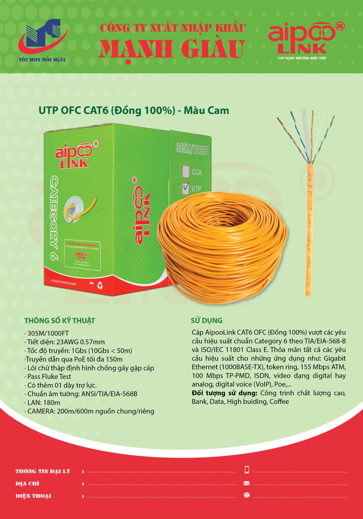 Cáp Aipoolink CAT6 OFC vượt các yêu cầu hiệu suất chuẩn Category 6 theo TIA/EIA-568-B và ISO/IEC 11801Class E.thỏa mãn tất cả các yêu cầu hiệu suất cho những ứng dụng như: Gigabit Ethernet (1000BASE-TX) tokenring, 155 MbpsATM, 100 Mbps TP-PMD, ISDN, video dạng Digitalhay Analog, Digital voice, PoE...