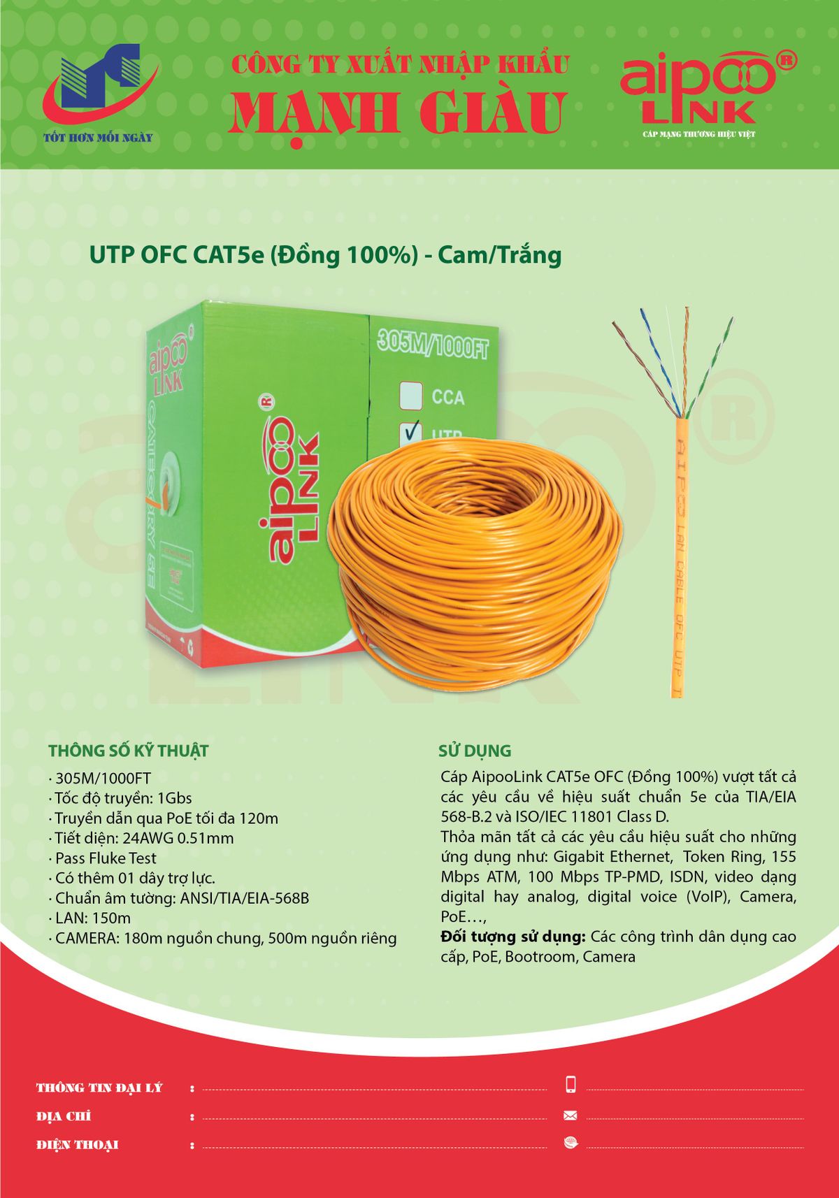 Cáp Aipoolink CAT5e OFC ( Đồng 100%) vượt tất cả các yêu cầu về hiệu suất chuẩn 5e của TIA/EIA 568-B.2 và ISO/IEC 11801 ClassD.