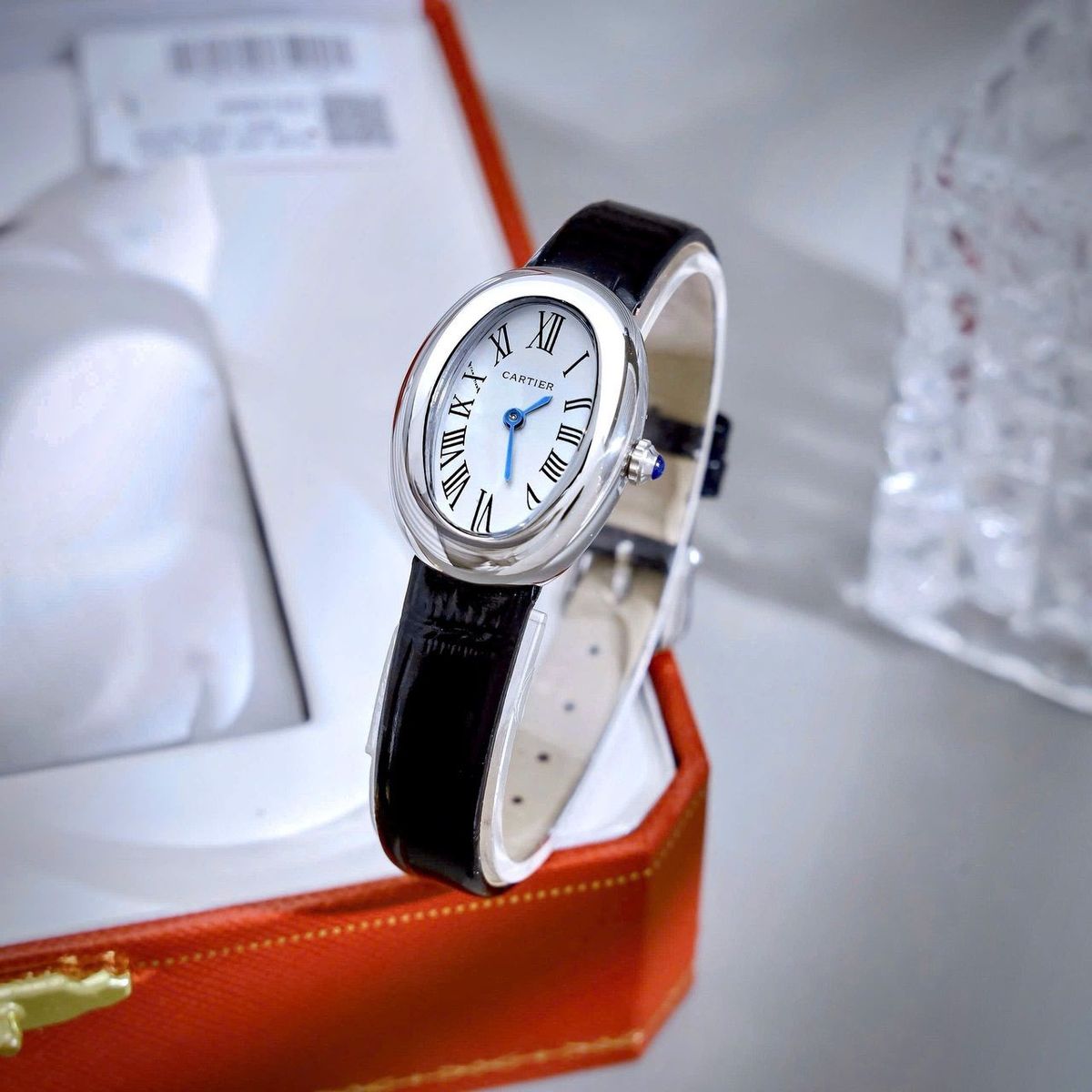 • Đồng hồ Cartier Baignoire 1920 WGBA0022 thiết kế oval mềm mại, sang trọng, mặt số bạc cổ điển với cọc số La Mã thanh lịch. Kim xanh đặc trưng và núm chỉnh đính cabochon sapphire, kết hợp dây da đen cao cấp, tôn vinh vẻ đẹp quý phái vượt thời gian