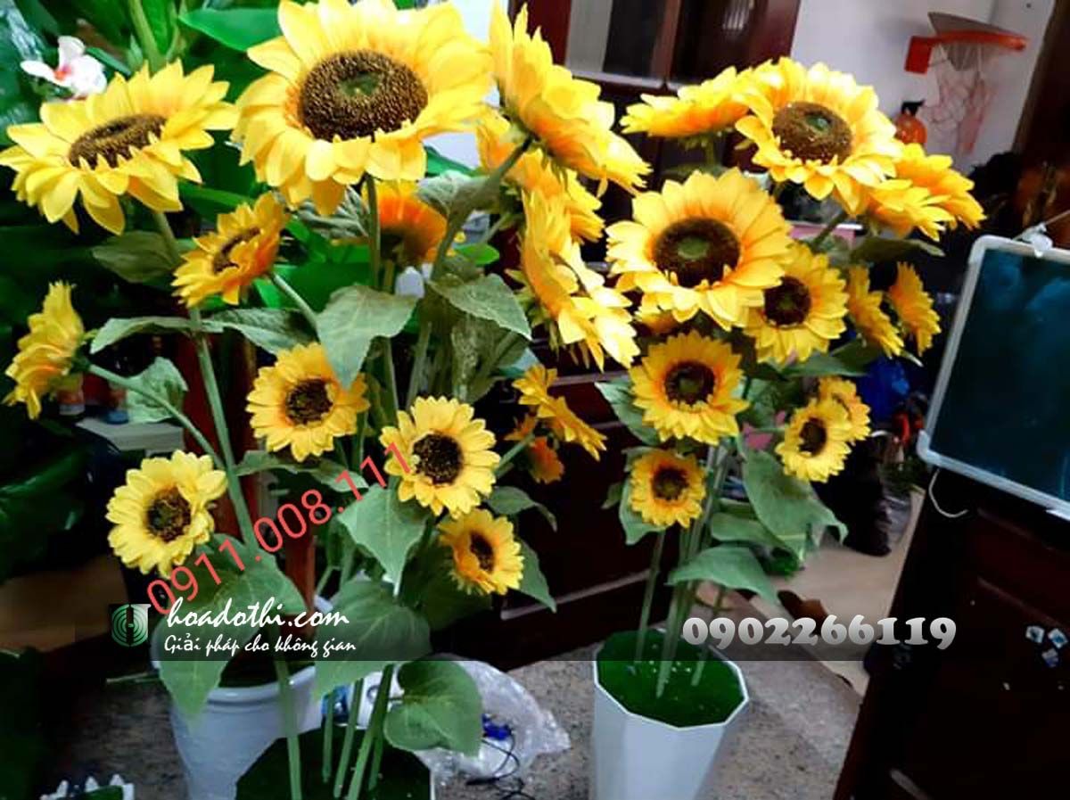 Cây hướng dương giả là 1 trong những sản phẩm bán chạy của chúng tôi. Để đặt sản phẩm Cây hướng dươn giả, Cây giả trang trí quý khách hàng có thể liên hệ trực tiếp qua để được chúng tôi tư vấn cụ thể hơn về loại hoa, kích thước, màu sắc, cũng như không gian cho bạn. Sau đó đội ngũ nhân viên sẽ tiến hành thi công tùy vào công trình, chúng tôi thi công trong vòng 3-5 ngày. Giá sản phẩm được tính theo kích thước của cây.