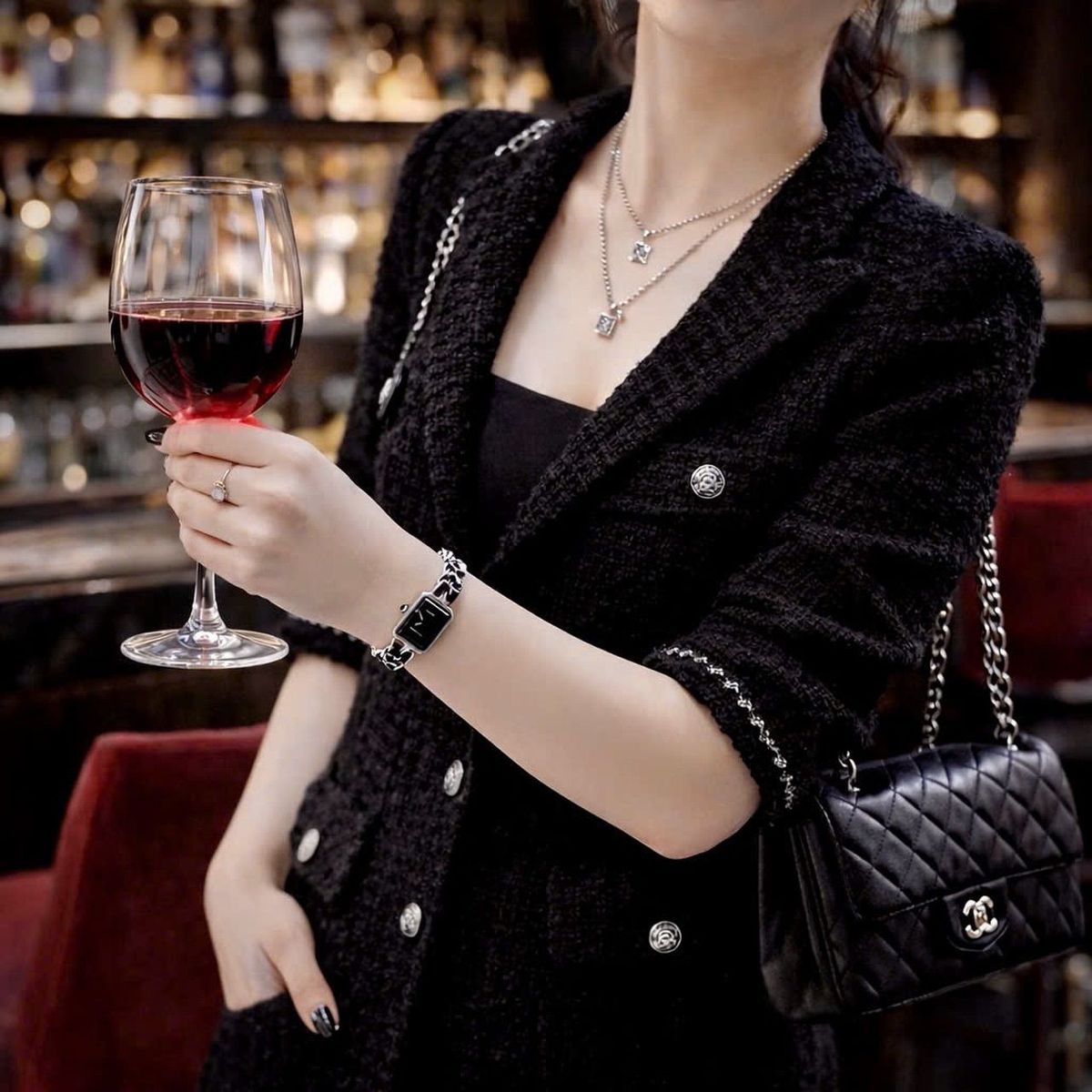 • Đồng hồ Chanel nữ nổi bật với thiết kế mặt vuông cổ điển, dây xích da phối kim loại sang trọng và mặt số đen tinh tế. Phong cách thanh lịch pha nét thời trang cao cấp, dễ phối trang phục, tôn vinh khí chất quý cô hiện đại và đẳng cấp.