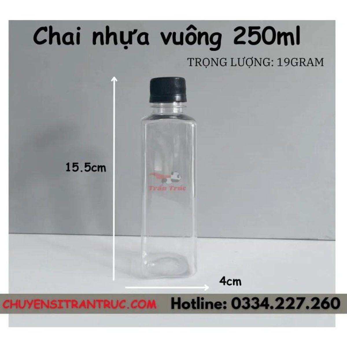 - Sản phẩm chất lượng: Chuyên sỉ Trần Trúc cam kết cung cấp sản phẩm chai nhựa vuông 250ml làm từ nhựa PET nguyên sinh, trong suốt, cứng cáp. Chai nhựa đẹp, với nhiều kiểu dáng hiện đại, thu hút