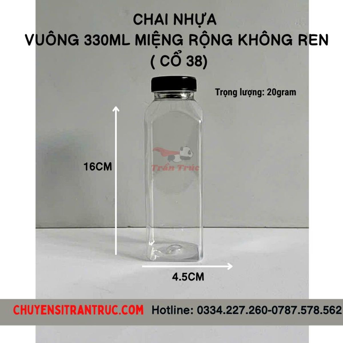 chai nhựa vuông 330ml miệng rộng bạn tìm kiếm khá phổ biến trên thị trường, đặc biệt là dùng để đựng các loại đồ uống có topping hoặc cần thêm thạch, chè như trà sữa, chè dưỡng nhan, nước ép, sữa chua.