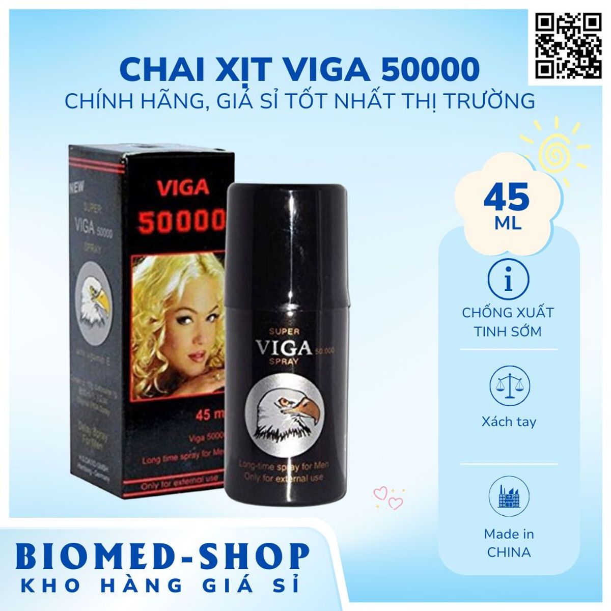 Thuốc xịt chống xuất tinh sớm Viga 50000 là một sản phẩm cao cấp dành riêng cho nam giới có nguồn gốc xuất xứ từ Trung Quốc, Khi xịt Viga 50000 vào sẽ giúp dương vật tê nhẹ, giảm sự nhạy cảm, qua đó giúp quý ông kéo dài thời gian quan hệ lâu hơn, từ 20 – 30 phút và luôn làm bạn tình hài lòng.