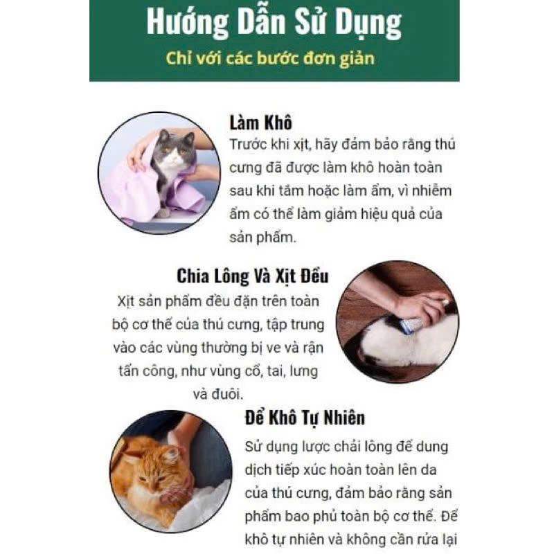 Cách sử dụng: lắc kỹ chai thuốc sau đó a/c xịt trực tiếp lên vùng bị ve rận như tai kẽ chân hoặc cả người càng tốt, xịt kỹ 1 lần là sạch ạ ,xịt k kỹ thì khoảng 2 ngày sau mình xịt nhắc lại (xịt thấm vào lông càng tốt ạ)