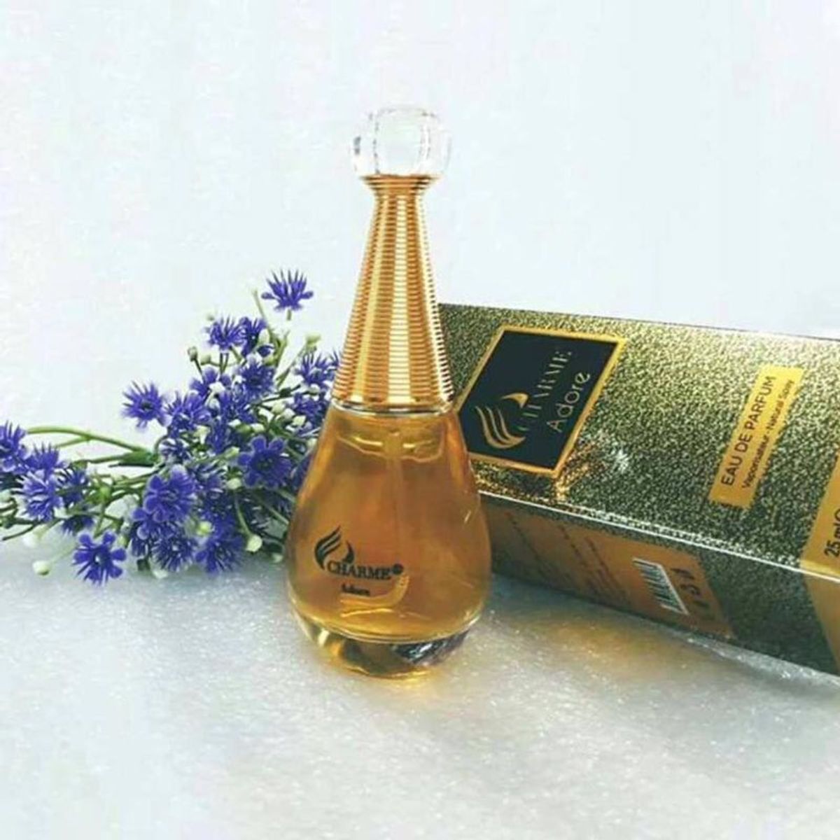 Mùi hoa nhài đằm thắm và hoa lan rạo rực giữ tông chủ đạo trong Charme Adore. Rực rỡ, gợi cảm, tinh tế, Adore là loại nước hoa tôn vinh sự trở lại của vẻ đẹp nữ tính và sức mạnh của những xúc cảm bột phát. Nó mang mùi hương của một bó hoa lan thơm ngát, cảm giác êm ái như nhung của mận xứ Đamas và vị ngọt đậm của gỗ Amarante.