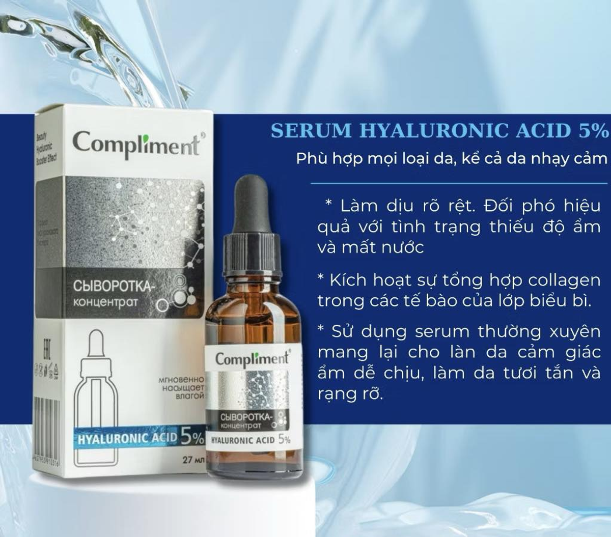 💎 Serum Compliment Hyaluronic Acid 5% 27ml giúp dưỡng ẩm sâu, cấp nước tức thì, làm mềm mịn và căng mượt làn da. 🌸 Công thức HA thẩm thấu nhanh, duy trì độ đàn hồi và sức sống cho làn da. ✨