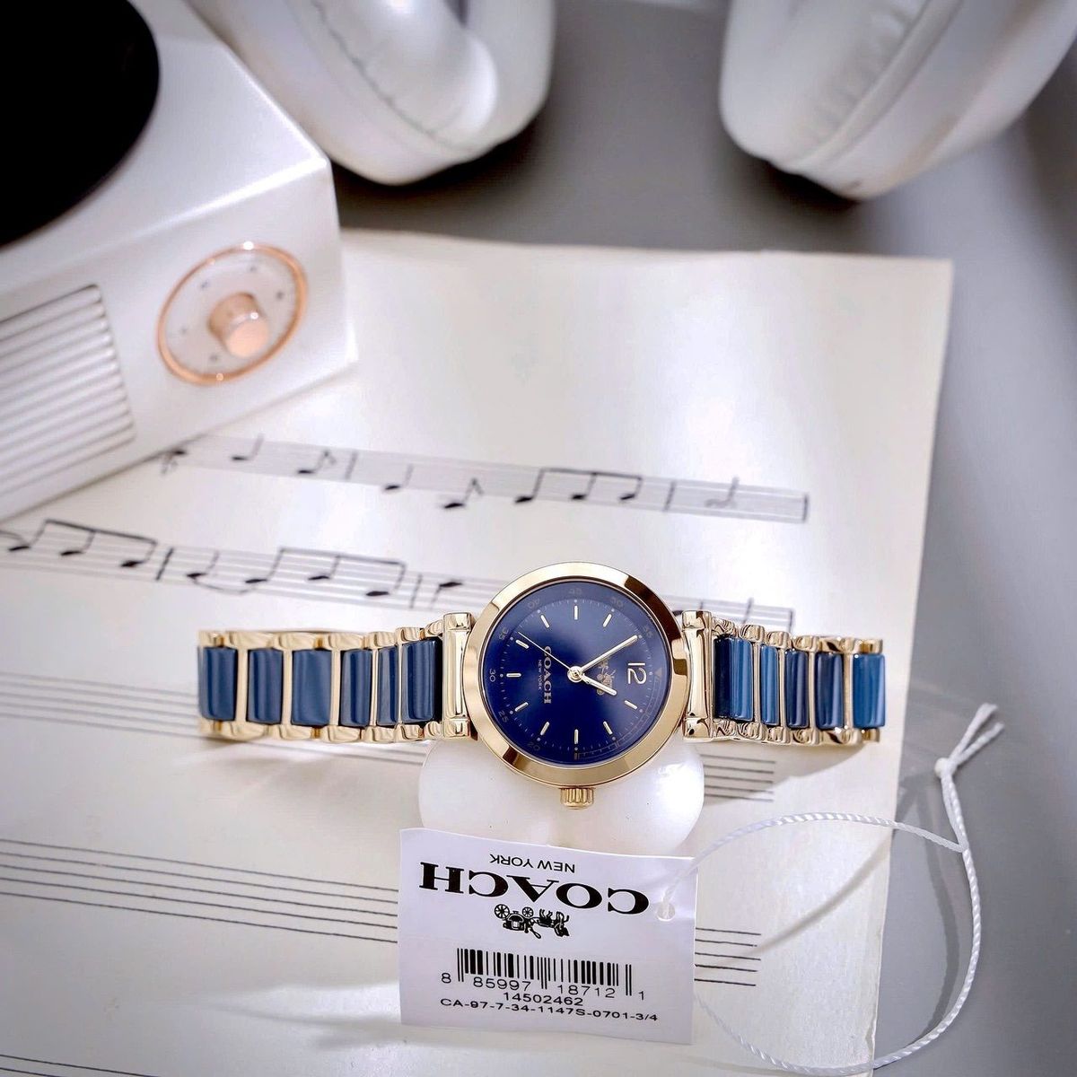 • Đồng hồ COACH mặt xanh navy sang trọng, khung vàng nổi bật, dây thép phối sứ xanh thời thượng, thiết kế tinh tế mang lại vẻ đẹp hiện đại, thanh lịch cho mọi phong cách nữ.