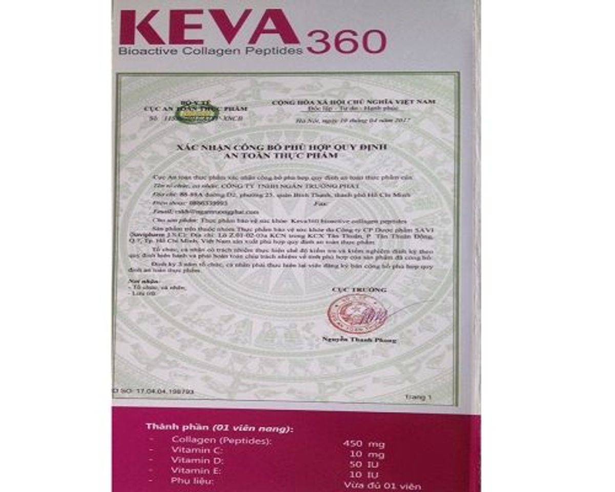 COLLAGEN KEVA 360 CỘNG DỤNG: Trắng da từ sâu bên trong Ngăn chặn tạo hắc tố menalin. Bảo vệ da từ các yếu tố bên ngoài kể cả tia UV. Thải độc, chống lão hóa. Kìm hãm quá trình lão hóa da. Làm mờ các vết nám, tàn nhang, đồi mồi Cân bằng nội tiết Bổ sung collagen và các dưỡng chất thiết yếu cho da, giúp da sáng lên tự nhiên từ bên trong cơ thể. Hỗ trợ cho người đang trong quá trình tập Gym, làm săn chắc cơ thể. Cải thiện đường tiêu hoá cho những người ăn không tiêu, ợ chua. Điều hoà kinh nguyệt Chống sơ vữa động mạch, bổ máu. Giảm quá trình tích tụ chất béo, loại bỏ nếp nhăn, các vùng da chảy xệ. Tái tạo da thô, giúp da sáng mịn, giảm thâm nám. Lượng Collagen cao kết hợp với các vitamin E , C , D giúp hấp thu nhanh vào cơ thể gấp 8 lần giúp đẹp da , tốt cho xương , tóc móc , hệ thần kinh . 100% Collagen và Vitamin C, D, E Nguyên liệu từ Đức và sản theo công nghệ của Đức. Cam kết KHÔNG HIỆU QUẢ HOÀN TIỀN. Cam kết hoàn tiền cho khách hàng nếu sản phẩm chứa thành phần gây hại, gây ra tác dụng phụ hoặc hoặc để được tư vấn.