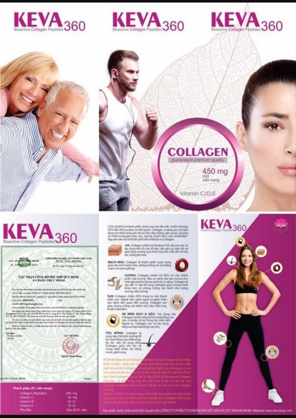 THỰC PHẨM CHỨC NĂNG KHÔNG PHẢI LÀ THUỐC VÀ KHÔNG CÓ TÁC DỤNG THAY THẾ THUỐC CHỮA BỆNHHÀNG ĐÃ ĐƯỢC CHỨNG NHẬN VỆ SINH AN TOÀN THỰC PHẨMNGƯỜI VIỆT NAM ƯU TIÊN DÙNG HÀNG VIỆT NAMCOLLAGEN KEVA 360 50 VIÊN ------------- Thành phần của Collagen Keva 360 Collagen peptides: 450mg Vitamin C: 10mg Vitamin D: 50IU Vitamin E: 10IU Phụ liệu: vừa đủ 1 viên Có thể bạn chưa biết: Collagen Keva 360 có ích với da: Collagen chiếm khoảng 70% cấu trúc da và được phân bổ chủ yếu ở lớp hạ bì của da. Kích thích quá trình trao đổi chất, tạo độ đàn hồi của da. Sự suy giảm về và số lượng collagen sẽ dẫn đến hậu quả “lão hoá” của cơ thể mà sự thay đổi trên làn da, trên khuôn mặt. Chính vì vậy mà collagen đóng vai trò là một trong những chất quan trọng hàng đầu của ngành thẩm mỹ, đặc biệt là chăm sóc da, phẫu thuật thẩm mỹ. Collagen Keva 360 giúp vết thương nhanh lành sẹo: Collagen có tác động tích cực để sản sinh ra các tế bào da mới, giúp làn da hồi sinh nhanh chóng nên các vết thâm cũng sẽ bị làm mờ dần Collagen Keva 360 có ích với mạch máu: Collagen là hợp chất sản sinh ra mạch máu. Collagen giúp đề phòng xơ cứng động mạch và cao huyết áp, rất hữu hiệu với người bị bệnh xơ cứng động mạch não, nhồi máu cơ tim. Collagen Keva 360 có ích với xương: bên cạnh Canxi, Collagen chiếm 80% trong cơ cấu thành phần của xương.Vì vậy bổ sung collagen giúp xương chắc khỏe hơn và phòng chống các bệnh như loãng xương, xốp xương.Việc bổ sung collagen còn giúp ngăn ngừa và giảm thiểu các bệnh liên quan đến khớp xương, thoát vị đĩa đệm và một số bệnh về xương, sụn khác Collagen Keva 360 có ích với mắt: Thiếu collagen làm cho giác mạc hoạt động kém, gây ảnh hưởng đến thị lực của mắt và làm cho thủy tinh thể mờ đi, đây chính là nguyên nhân gây ra bệnh đục thủy tinh thể mắt. Collagen Keva 360 có ích với tóc, móng chân – tay: bổ sung collagen giúp cho tóc và móng chân, móng tay bóng mượt, mịn màng, chắc khỏe cũng như có tác dụng hạn chế rụng tóc. Dầu gội đầu có chứa collagen có tác dụng giữ ẩm và làm suôn mượt tóc. Collagen Keva 360 tăng cường hệ miễn dịch: Collagen tăng cường khả năng hoạt động của vi khuẩn có vai trò quan trọng trong cơ chế miễn dịch của cơ thể. Collagen có tác dụng cải thiện chứng táo bón hay gặp ở phụ nữ, giữ da đẹp và tăng cường khả năng hoạt động của não. Collagen Keva 360 còn có tác dụng tích cực đến các cơ quan nội tạng, răng miệng cũng như hạn chế sự phát triển của các tế bào ugn thư