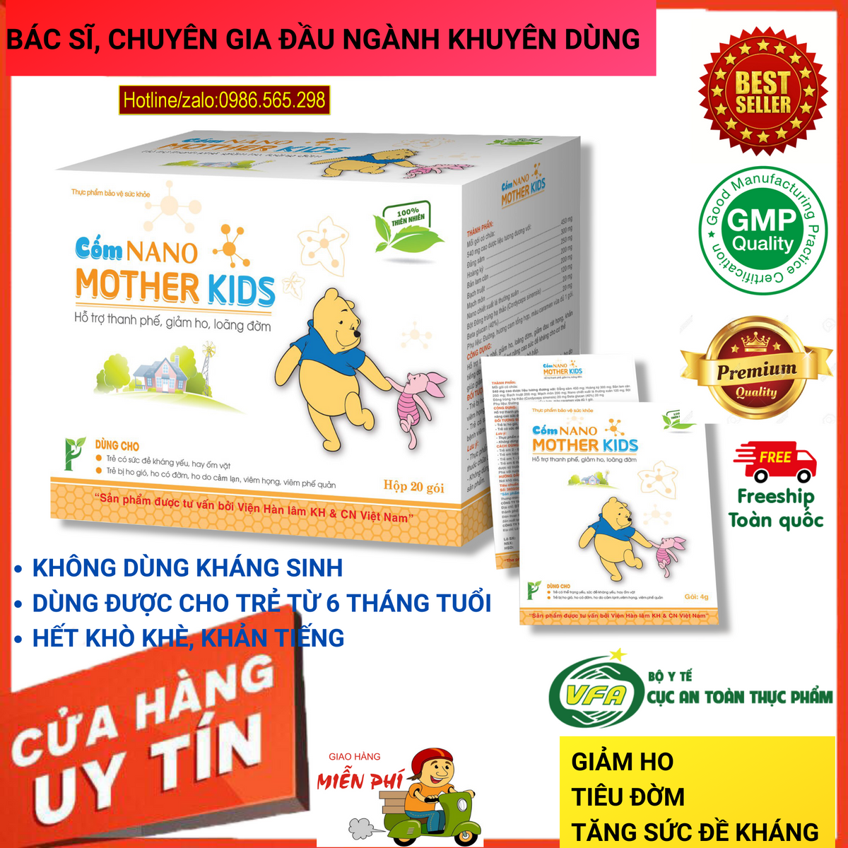 Bố mẹ đừng quên TĂNG SỨC ĐỀ KHÁNG cho con với CỐM NANO MOTHERKIDS: Con hết ho, sổ mũi, không sợ kháng sinh chẳng lo tái phát Con dứt ho sau 3 ngày 15 ngày ổn định đường hô hấp Chấm dứt tình trạng ra mồ hôi trộm Hết liệu trình 1 tháng tăng đề kháng tự nhiên, không kháng sinh, ngăn tái phát Sản phẩm đã được BỘ Y TẾ- CỤC AN TOÀN VỆ SINH THỰC PHẨM cấp phép và đồng hành cùng Bộ Y Tế trong việc bảo vệ sức khỏe của mẹ và bé. ------------- ------------------ CỐM NANO MOTHERKIDS - CON HẾT HO MẸ HẾT LO Mang đến sản phẩm chăm sóc sức khỏe tốt nhất cho gia đình bạn Chúng tôi quan tâm đến sức khỏe gia đình – của bạn và của chúng tôi – đây là lý do Phan An Green cố gắng mang đến sản phẩm tốt nhất cho sức khỏe. Chúng tôi không ngừng đặt câu hỏi “Điều gì là tốt nhất cho gia đình và đặc biệt là trẻ nhỏ?” Chúng tôi tự hào cam kết phát triển sản phẩm Cốm Nano cao và chúng tôi chỉ sản xuất các sản phẩm mà chúng tôi sẽ sử dụng cho chính gia đình mình. Phan An Green hiểu rằng từ khi sinh ra và trong suốt cuộc đời sau này, bé yêu luôn cần sự chăm sóc yêu thương của bố mẹ. Tình cảm thiêng liêng đó là cả một nghệ thuật và khoa học về việc chăm sóc và quan tâm đến bé yêu, những mầm non tương lai rất cần sự nuôi dưỡng và yêu thương đúng cách. Vì vậy, chúng tôi mang đến cho con Cốm Nano giúp thanh phế, giảm ho, hỗ trợ hệ miễn dịch, tăng sức đề kháng hệ hô hấp và đặc biệt an toàn cho trẻ. Đam mê lớn nhất của chúng tôi là tạo ra sản phẩm tốt nhất cho trẻ em và chúng tôi luôn cố gắng nghiên cứu các thành phần giảm ho tốt nhất cho sức khỏe của trẻ. Xem trọng điều đó, Phan An Green cam kết sản phẩm và dịch vụ chăm sóc khách hàng. Với phương châm “Sức khỏe của Khách hàng là niềm vui của Phan An”, thành công của chúng tôi chính là được thấy trẻ em phát triển khỏe mạnh!
