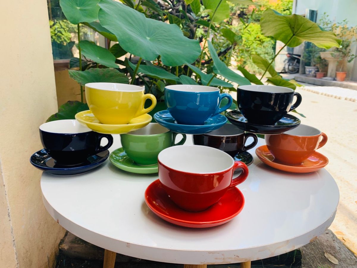 Cốc cafe cafe capuchino đủ màu là hàng sứ Bát Tràng, cốc có dung tích 220ml, thường có sẵn các mẫu. Xanh, đỏ, vàng, da, cam, đen, nâu..mua combo 10 bộ sẽ được đủ các màu