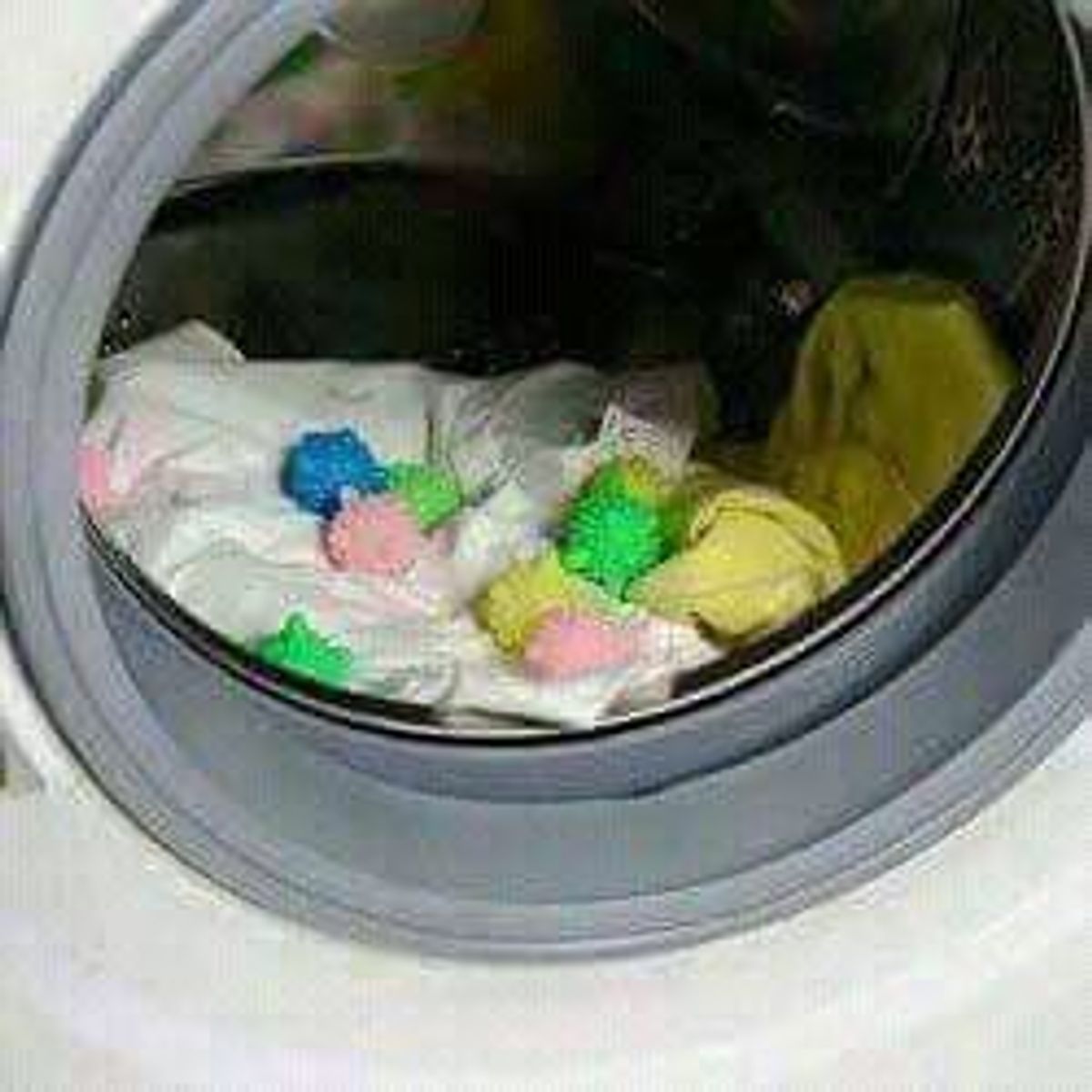Cho quần áo và đồng thời quả cầu gai vào máy giặt. Chỉ bấm nút giặt là xong ạ