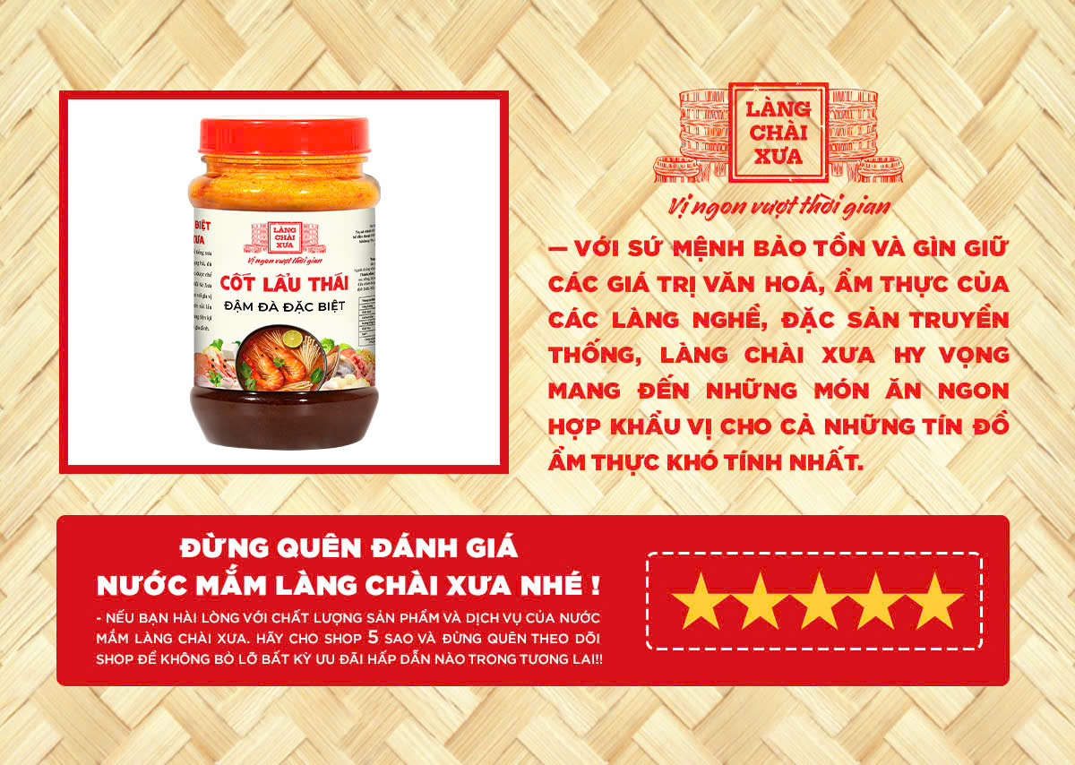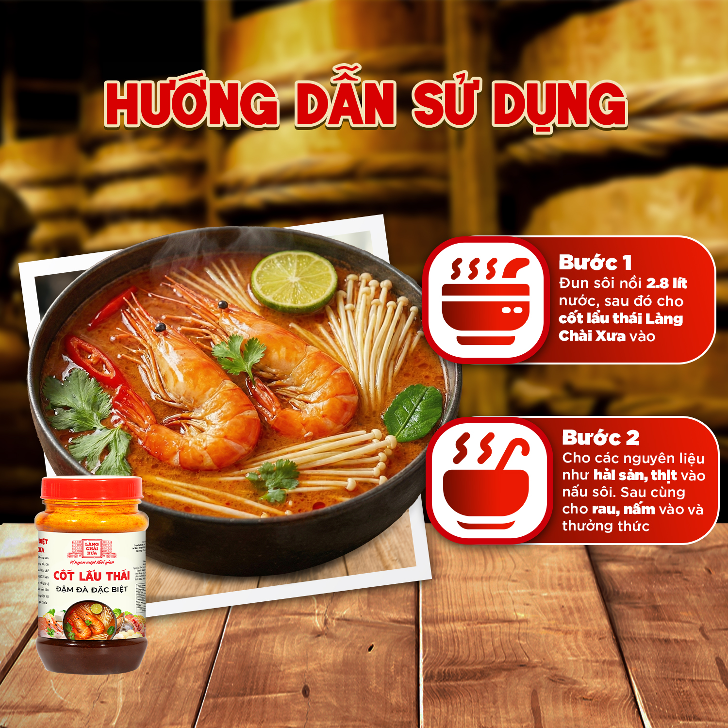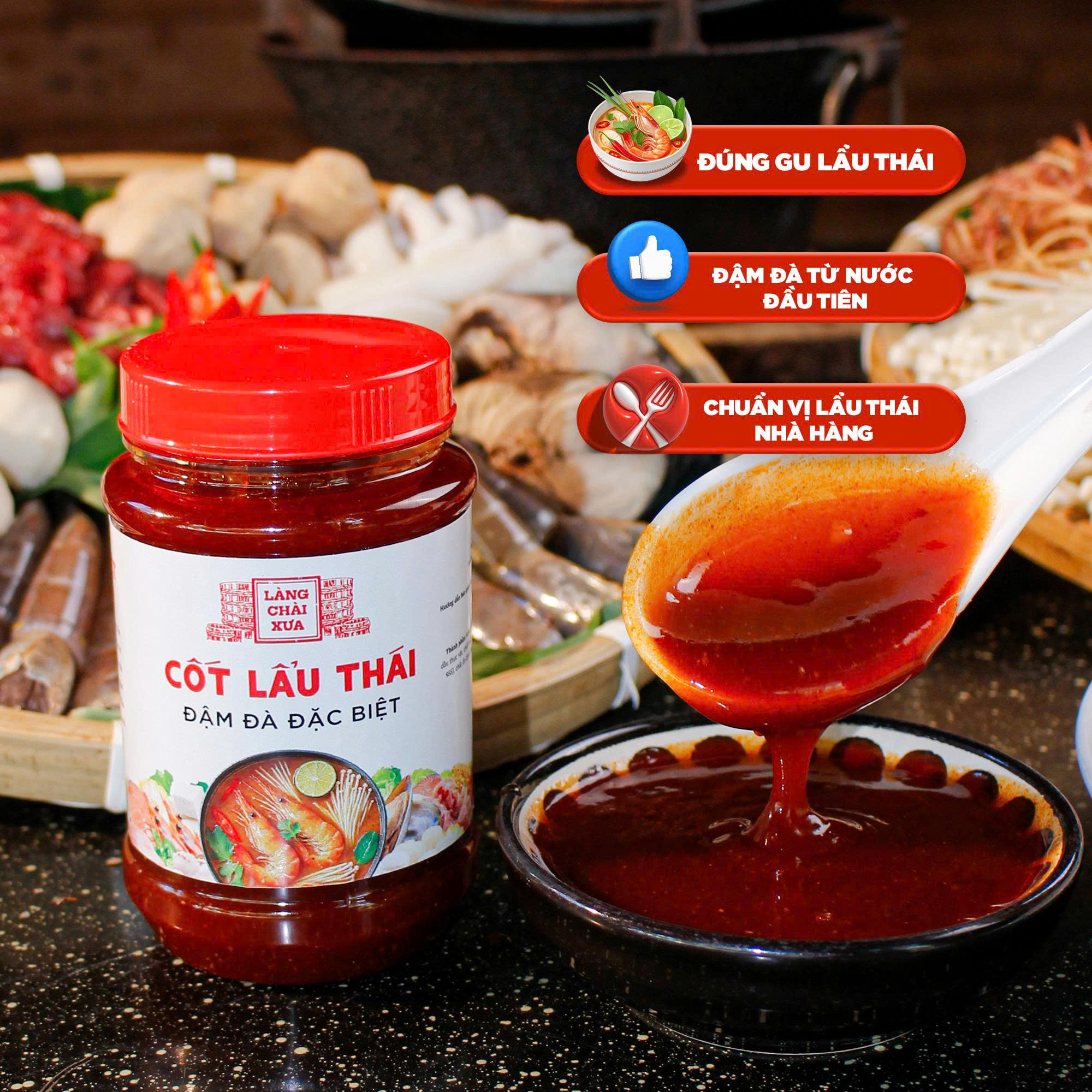 - Cốt lẩu Thái đặc biệt đậm đà nổi tiếng xưa nay của Làng Chài Xưa đã có dạng hũ, đủ dùng cho nồi 2,8 lít nước. Cốt lẩu được chế biến bởi các đầu bếp nhà hàng Mũi Né Xưa đúng hương vị lẩu Thái tươi ngon với gia vị mắm muối truyền thống tạo nên nồi lẩu thơm ngon tuyệt vời mà lại vô cùng tiện lợi nhanh chóng, dùng được cho cả gia đình.