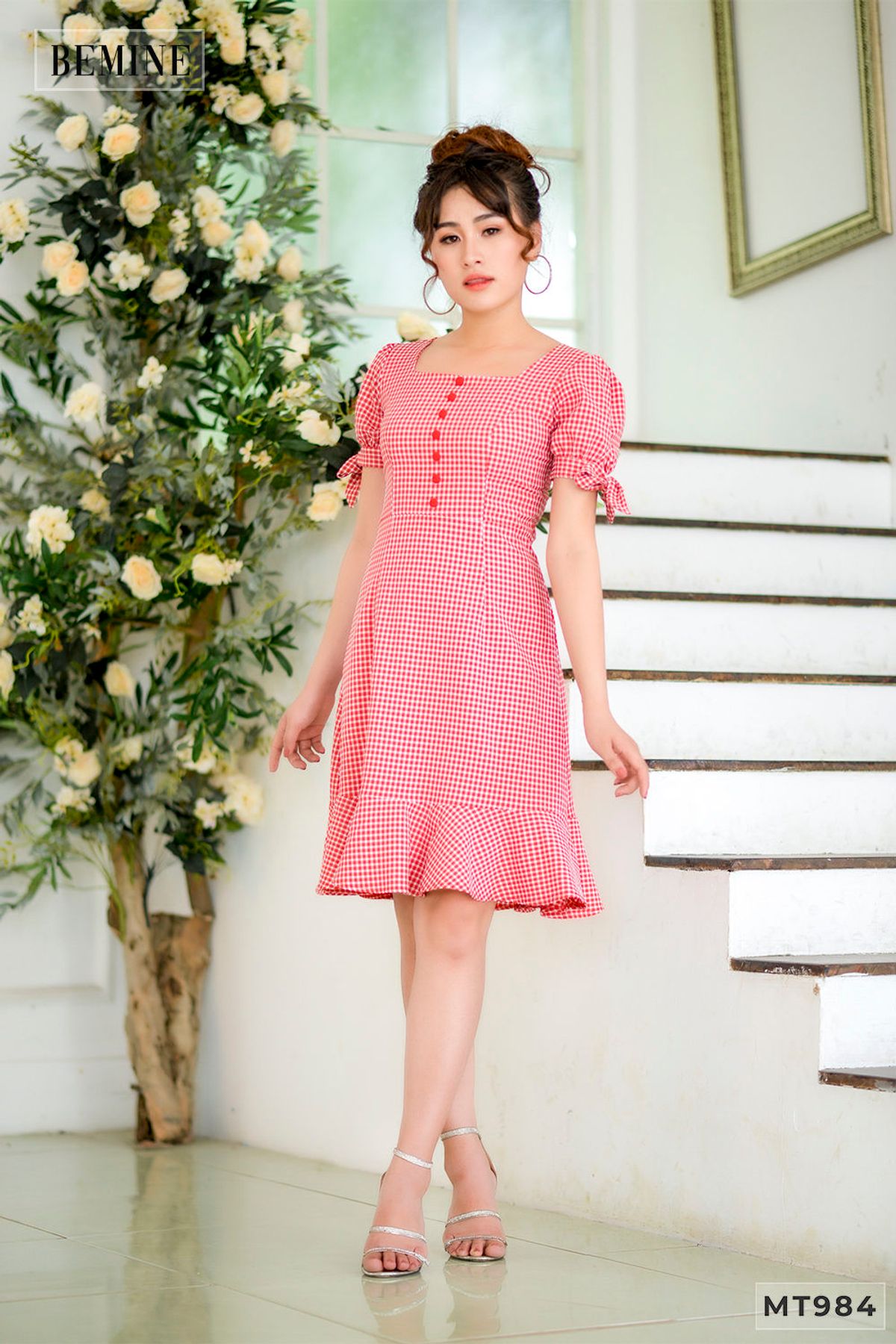 Đầm caro đỏ nơ tay giá sỉ - giá bán buôn