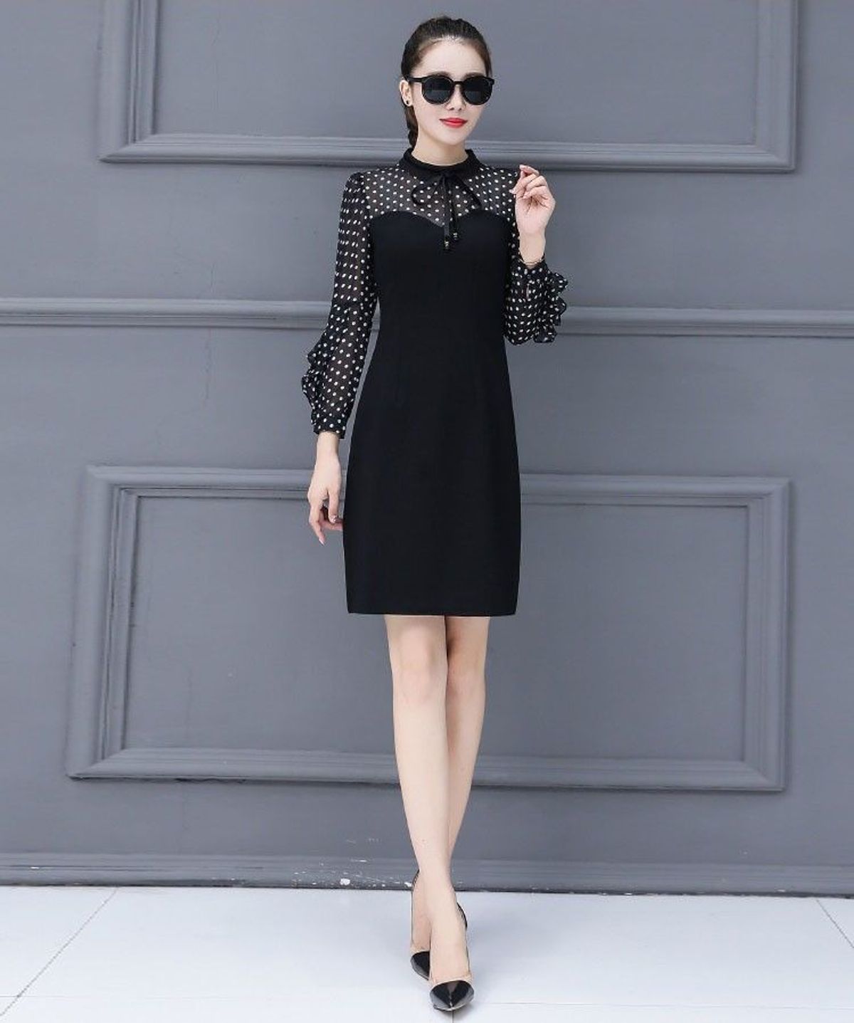 Kiểu dáng: đầm xòe nhẹ, cổ bèo trụ, phối bi cổ và tay