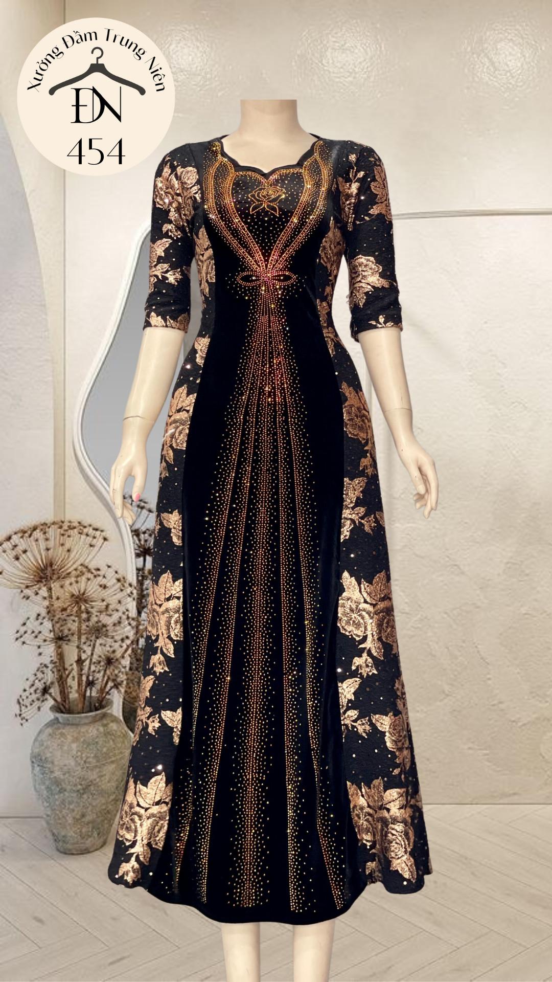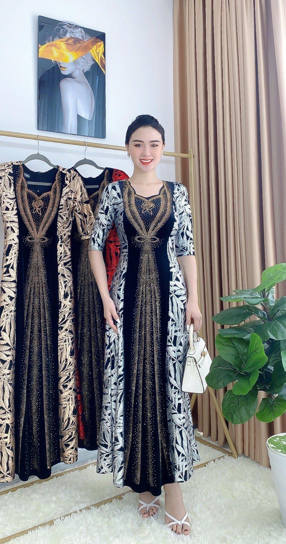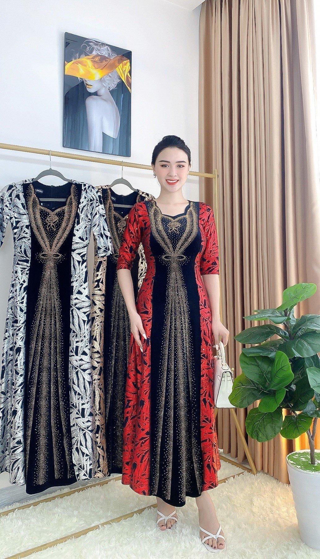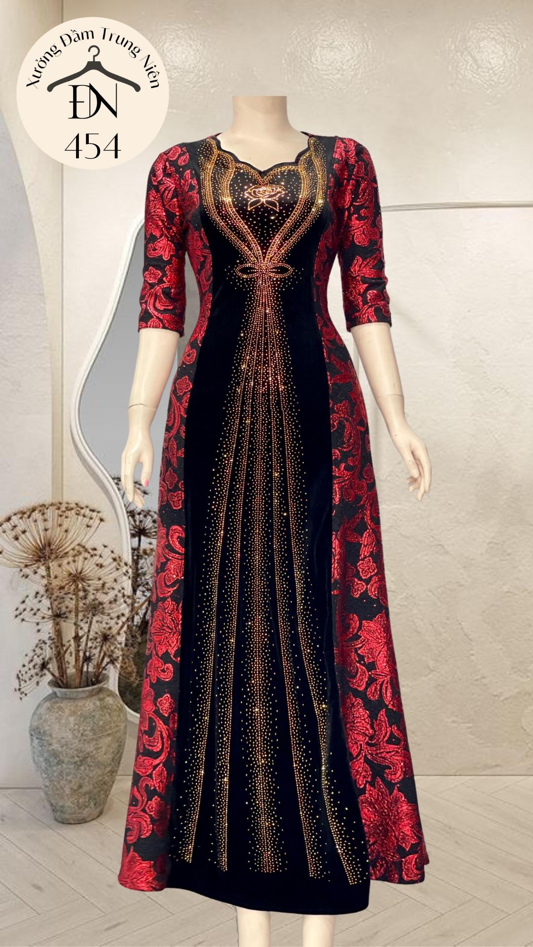 1. Chi tiết sản phẩm: Đầm dạ hội trung niên chất nhũ kim sa phối nhung có lớp lót, đính đá cao câp, co giãn cực tốt cho mẹ dự tiệc sang trọng bigsize cao cấp DN26